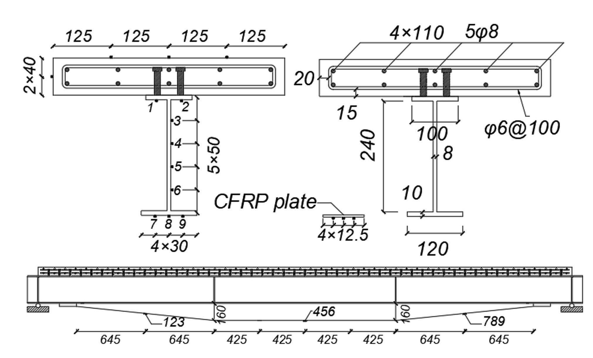 The specimen was reinforced on the lower surface of the steel beam by means of a string-type CFRP plate. The spacing between the support rods is 1700 mm, and the spacing between the loading points is also 1700 mm.