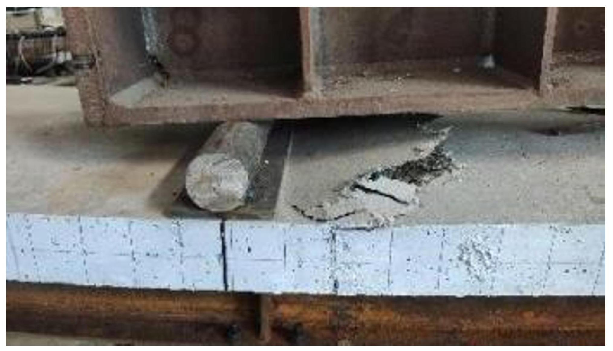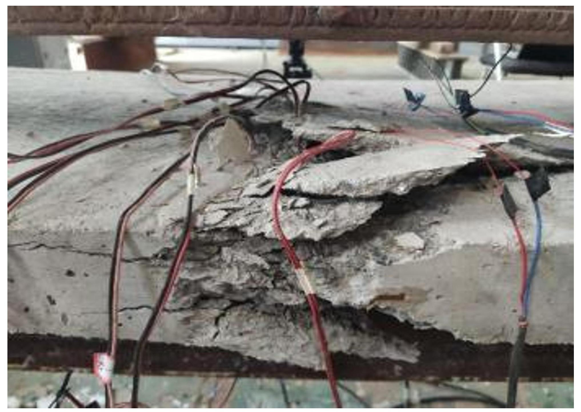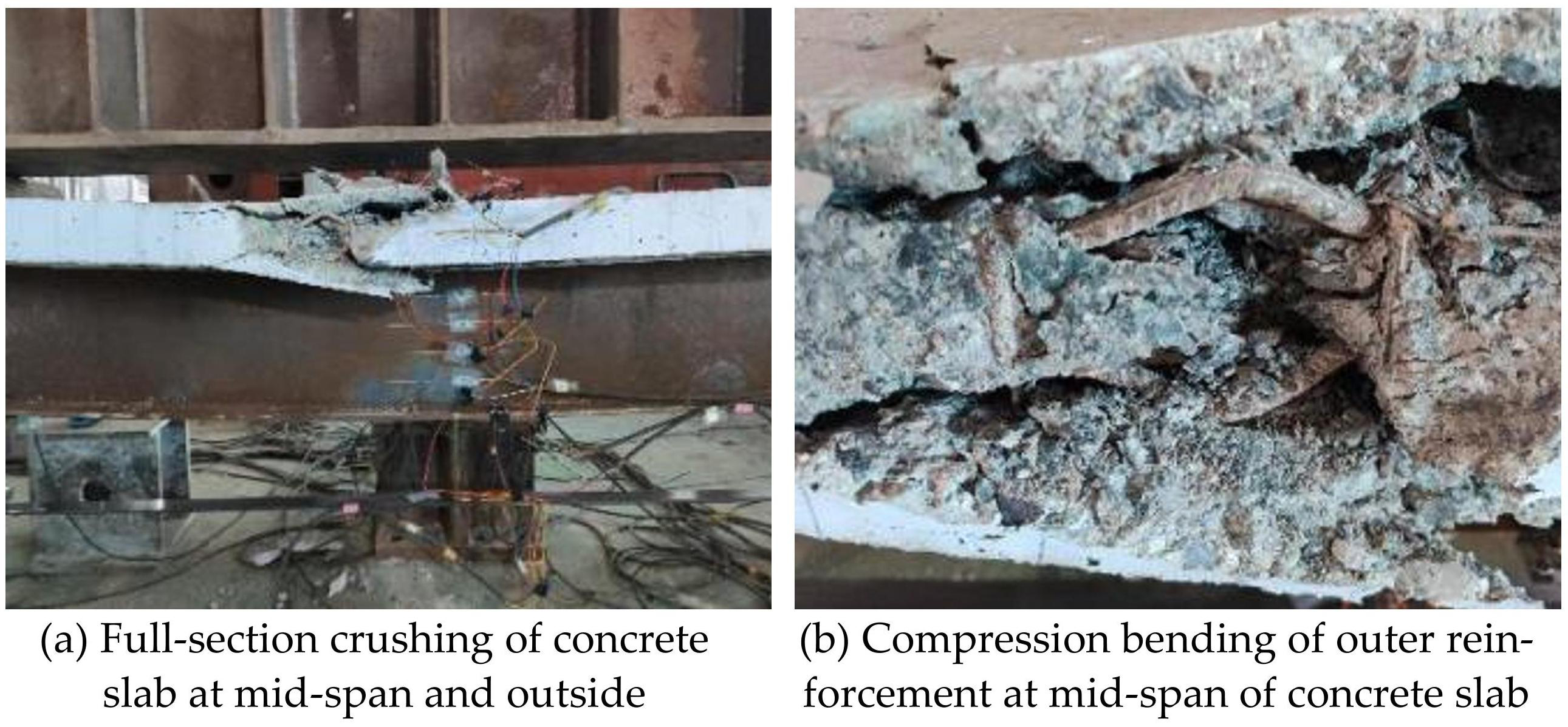 The height of the fourth beam support rods is 186 mm. When the load reaches 270 kN, the lower flange of the steel beam yields. When the load reaches approximately 470 kN, the CFRP plate emits a slight hissing sound. When the load reaches 490 kN, the sound of fiber tearing in the CFRP plate is more frequent, and the growth of mid-span deflection is accelerated. When the load reaches 500 kN, a local bulge occurs on one side of the upper surface of the concrete slab, which means the local failure of the concrete slab. When the load reaches 510 kN, the concrete slab is compressively damaged in the mid-span full section, and the concrete blocks in the midspan are staggered and bulged, as shown in Figure9.