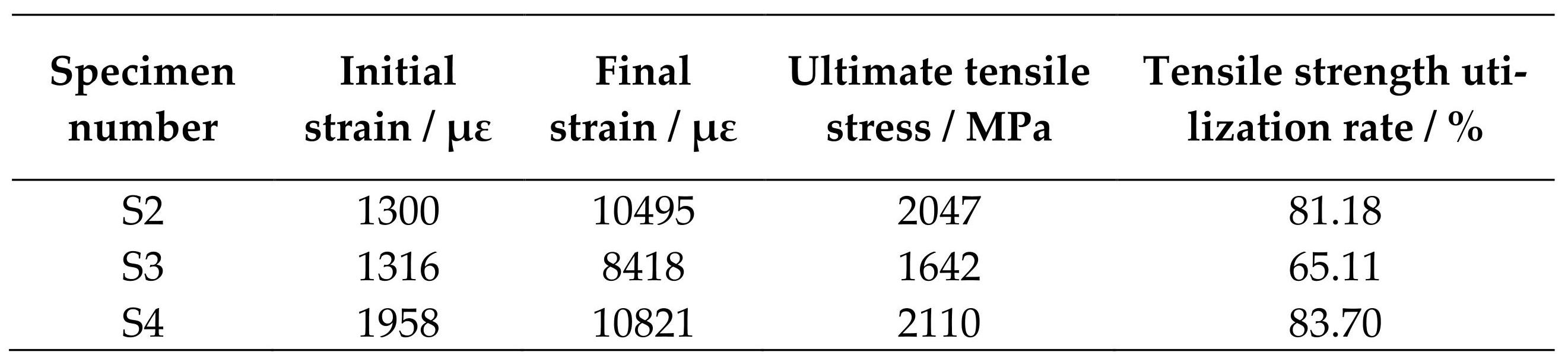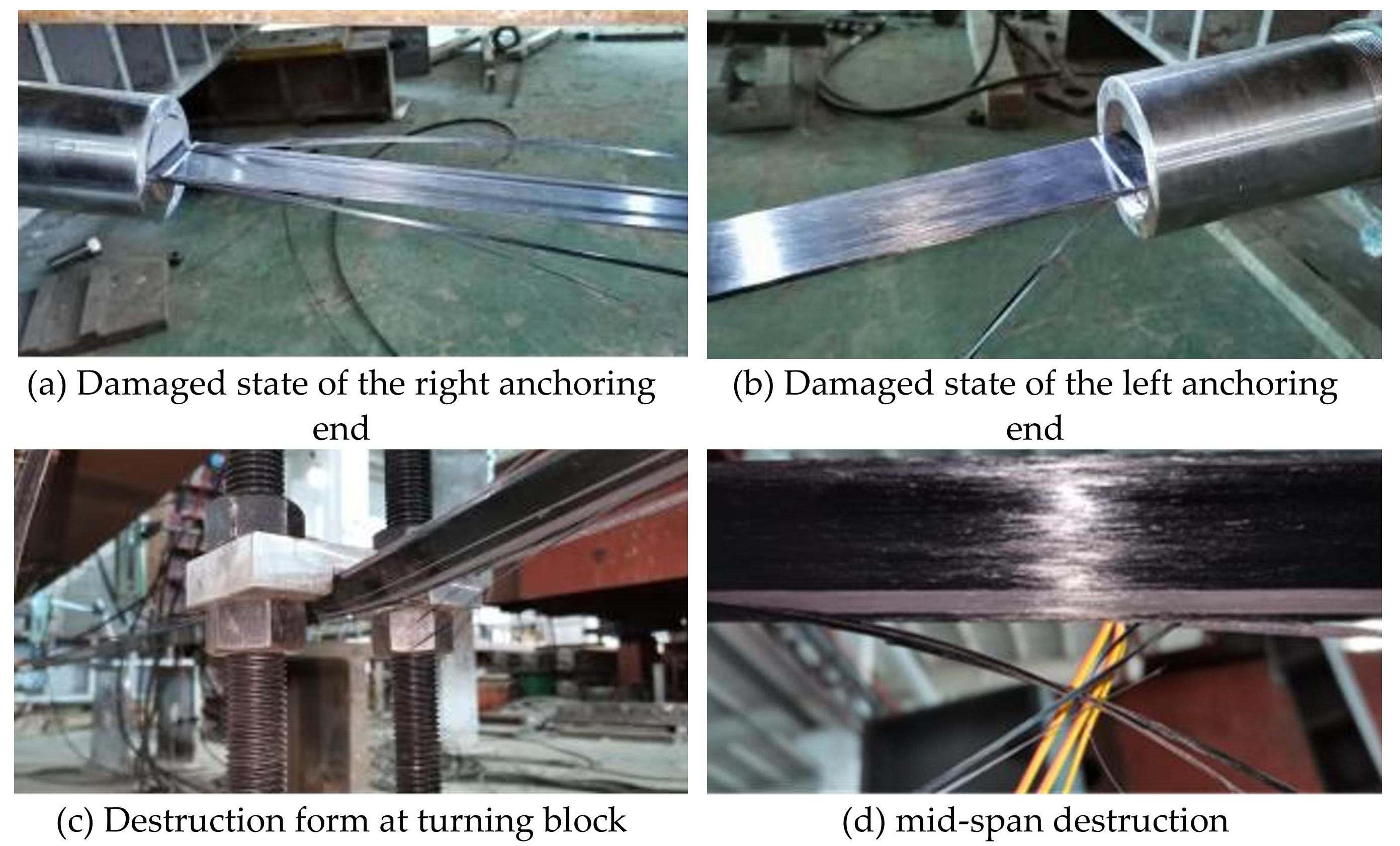 From the test phenomenon, the damage of the CFRP plate reinforced by the tension string mostly occurs at the clamping end of the anchor and the position of the steering block, and the CFRP plate is prone to stress concentration at these two positions. By selecting suitable anchor clips, increasing the contact area between the steering block and the CFRP plate, and avoiding sharp turning of the CFRP plate at the turning point, stress concentration can be avoided, and the strength utilization rate of the CFRP plate can be improved.