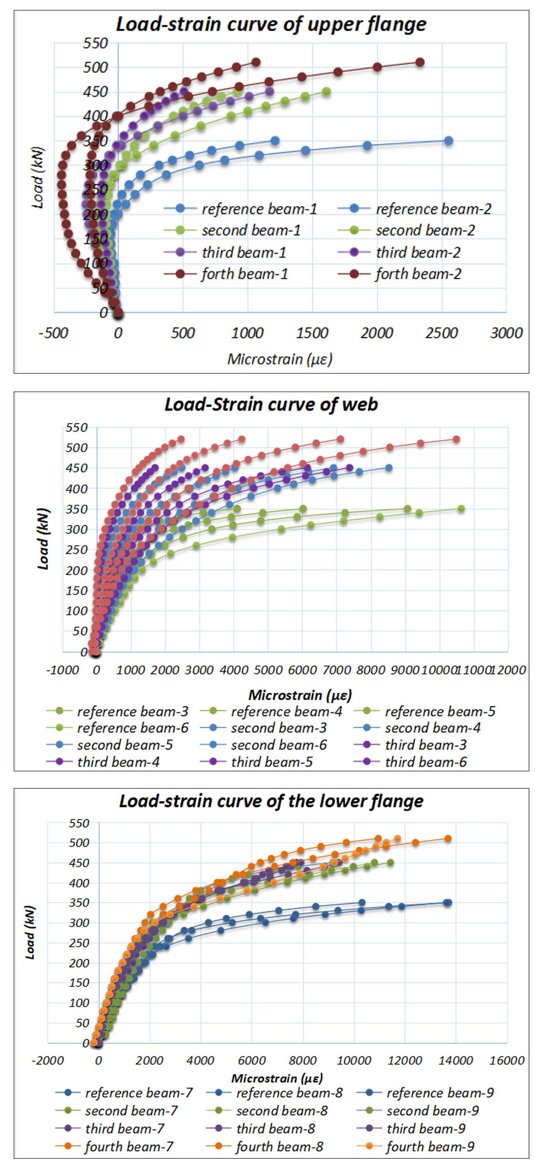 The load-strain curves of the upper flange, web and lower flange of the steel beam are shown in Figure11. The figure shows that the stiffness, yield load and ultimate bearing capacity of the composite beam can be effectively improved by increasing the cross-sectional area of the CFRP plate and increasing the prestress level. As a result, the strain in the upper flange, lower flange and web under the same load level is significantly reduced.