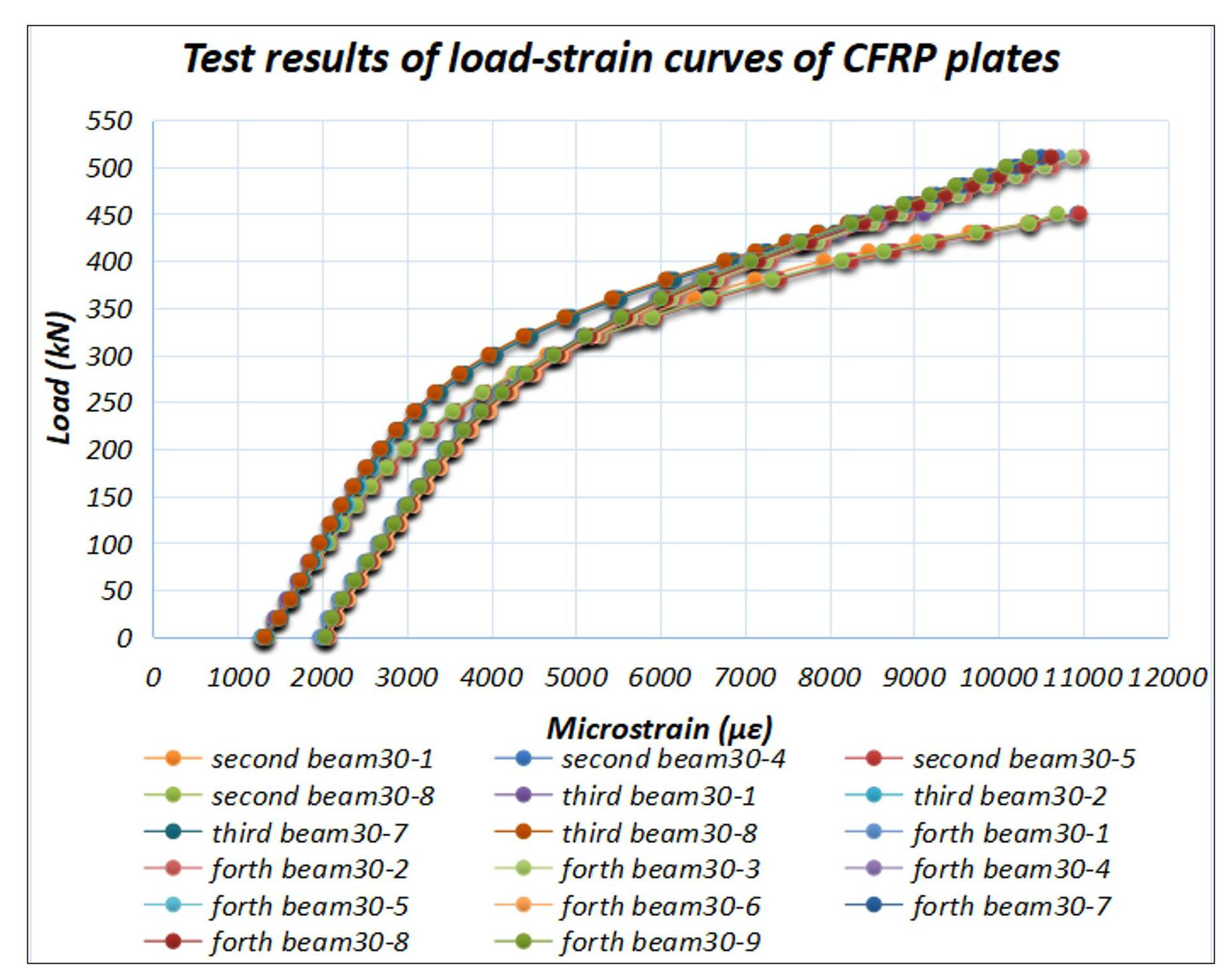 Although the CFRP plate itself is a linear elastic material, the CFRP plate and the composite beam should conform to the deformation coordination, so the trends of the CFRP plate load-strain curve and the mid-span load‒deflection curve are similar. The ultimate tensile stress and tensile strength utilization are shown in Table2. As seen from the table, the premature failure of the CFRP plate of the third beam resulted in a strength utilization rate of only 65.11%. Both the second beam and the fourth beam have more than 80% strength utilization of CFRP panels.
