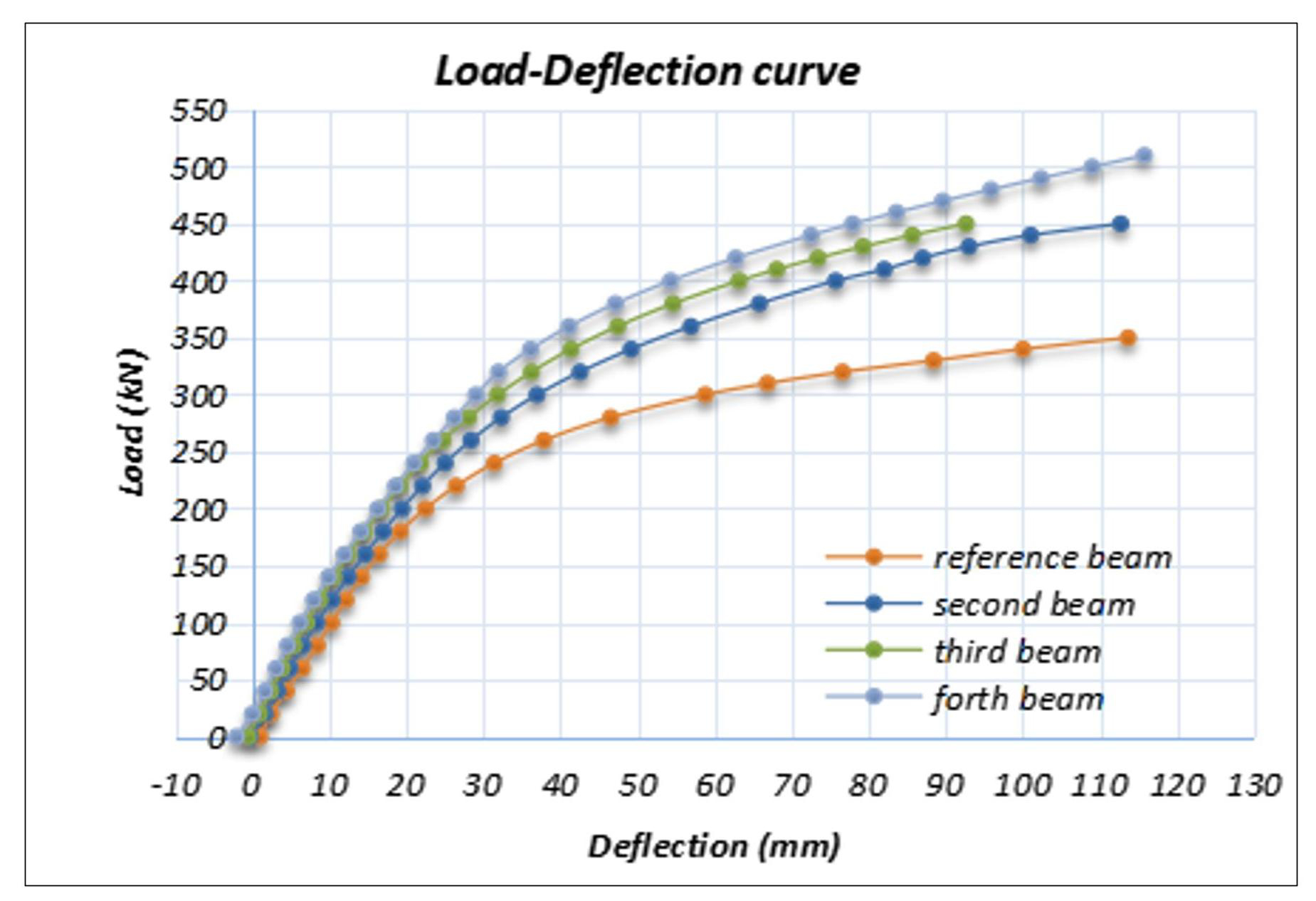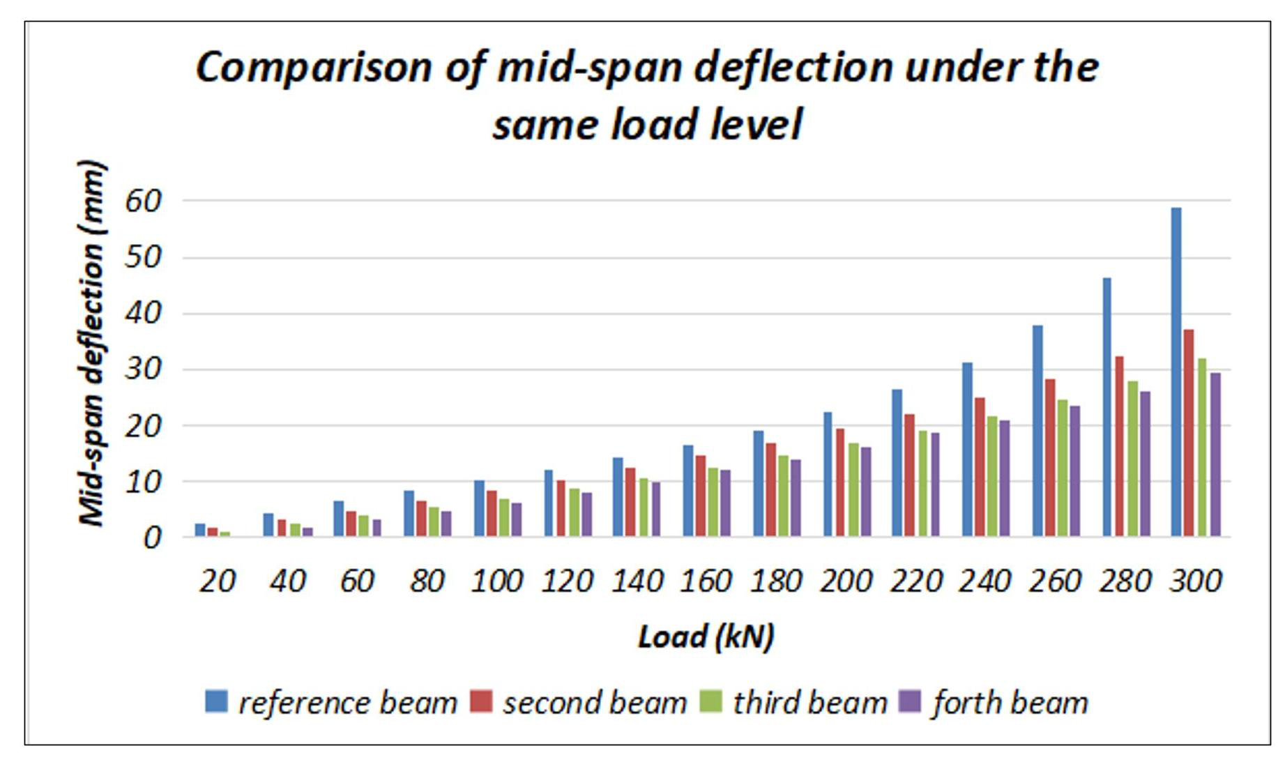The mid-span deflection curves of the four test beams are shown in Fig.13.