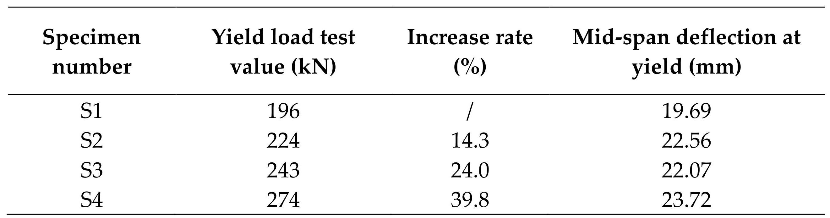 The improvement effect of the yield bearing capacity of the specimens is shown in Table3. By comparing the second beam and the reference beam, it can be seen that the CFRP plate reinforcement increases the yield bearing capacity of the composite beam by approximately 30 kN, and the effect is obvious. By comparing the second beam, the third beam and the fourth beam, it can be seen that an increase in the thickness and prestress level of the CFRP plate can lead to an improvement in the yield bearing capacity. The yield load is increased by approximately 40% in the last set.