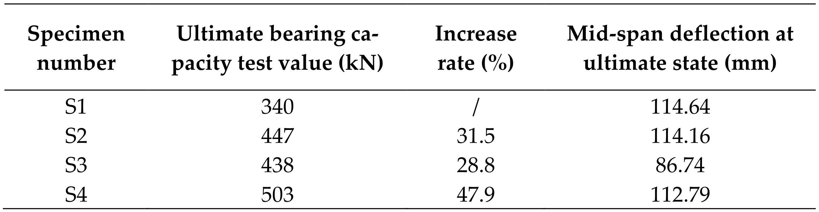 The improvement effect of the ultimate bearing capacity of the specimen is shown in Table4. Except for the poor reinforcement effect of the carbon plate of the third beam due to premature failure, the rest of the test beams have received goodreinforcement effects. Among them, the bearing capacity of the fourth test beam was increased by nearly 50%.
