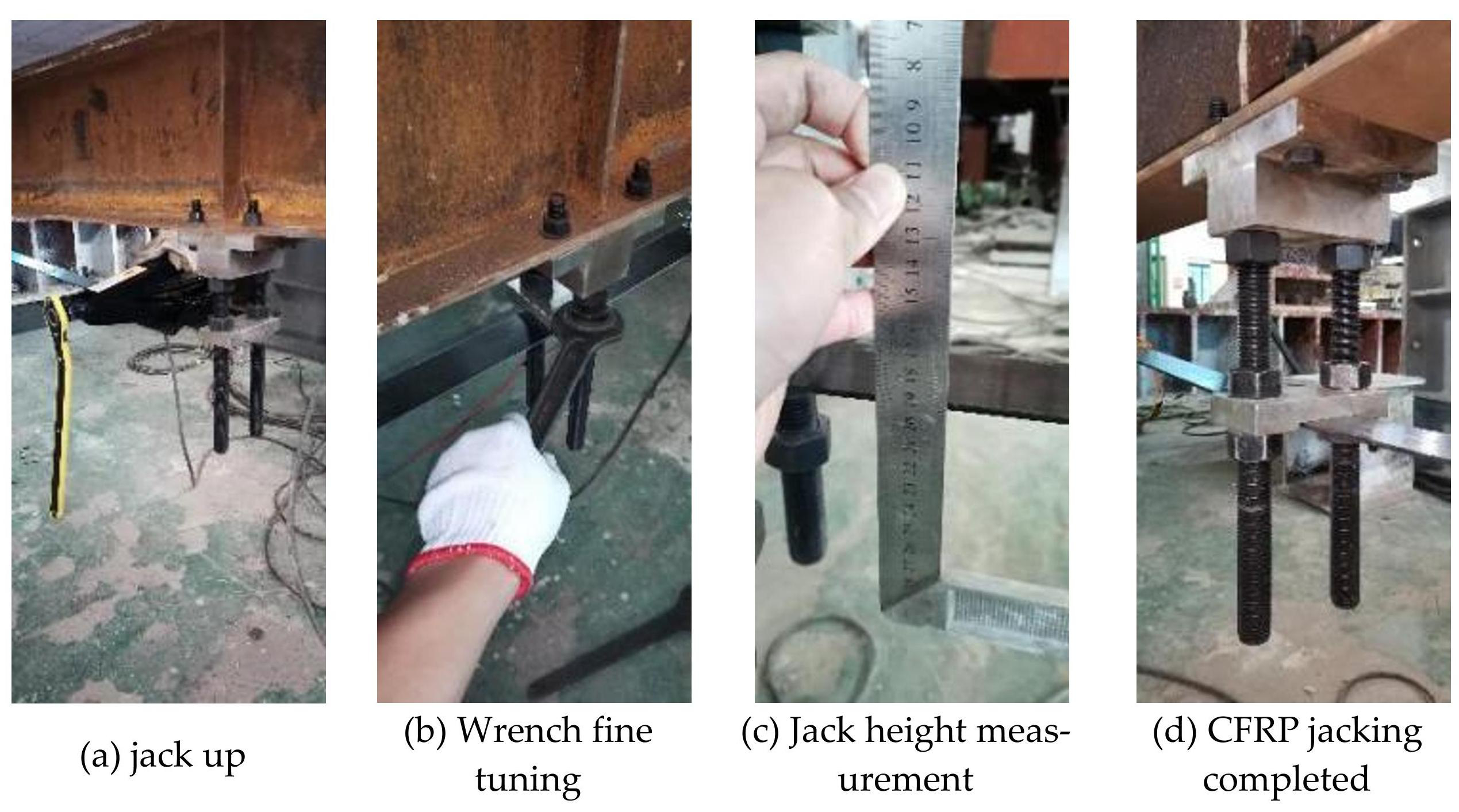 Since the strain in the CFRP plate will be lost to a certain extent when the jack is unloaded, the height of the jack needs to be slightly higher than the theoretical value. After unloading, the wrench is used to fine-tune the nut to accurately control the prestress level to reach the target value and make the heights of the four support rods equal.