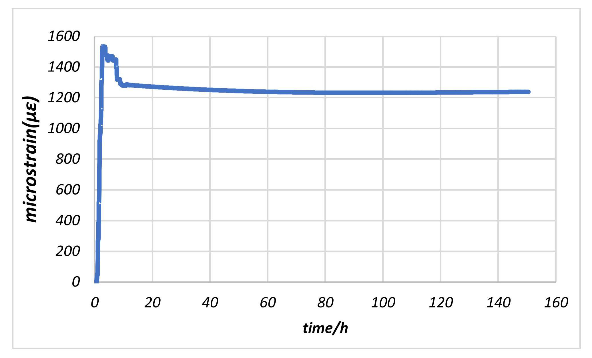 After the prestressing was completed, the loss of the tensioned CFRP plate reinforcement system was measured. The prestress loss measurements were performed on the third beam and the fourth beam. The relaxation measurement time for the third beam was 6 days. The relaxation measurement time for the fourth beam was 5 days. During the6 days of prestress level monitoring, the prestress level had no tendency to continue to decrease after the initial small drop, and its value remained stable, so there was no need to continue monitoring. A representative strain loss curve is shown in Figure3.