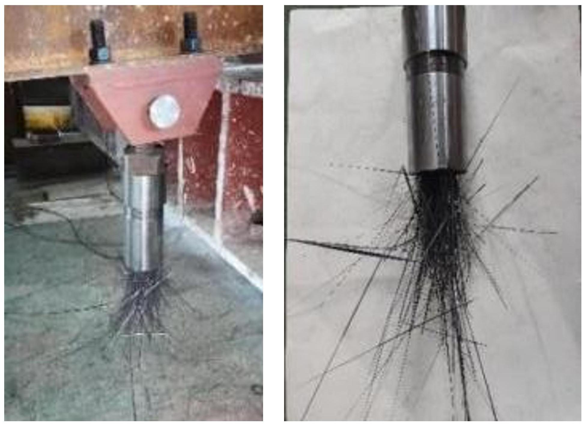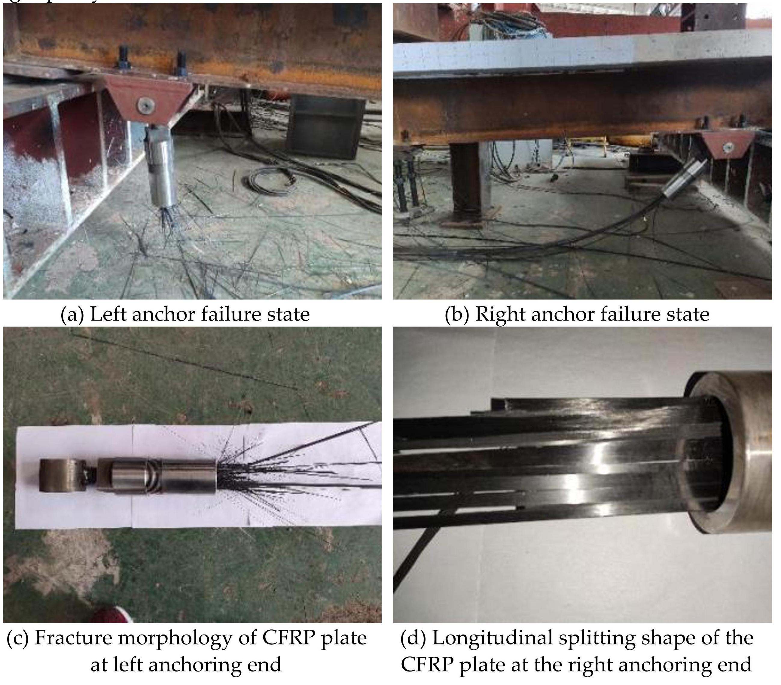 After the CFRP plate is broken at the left anchoring end, the fibers of the CFRP plate are burst-like, as shown in Figure7 (c) . The remaining CFRP plate was split longitudinally and dropped from the right anchoring end to the ground, as shown in Figure7 (d) .