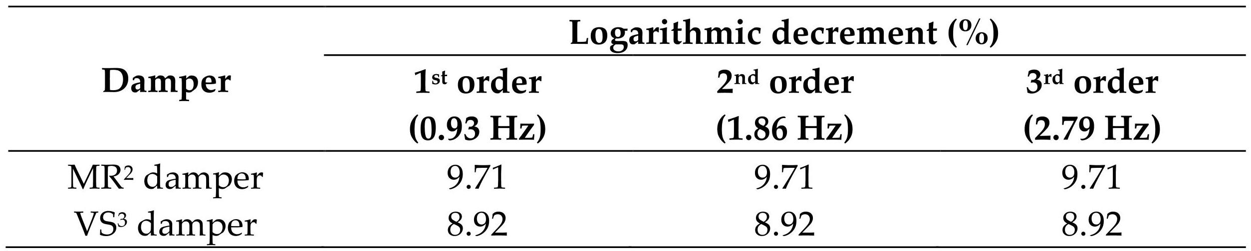 For each type of damper, OVM and Tongji University jointly carried out a comparative application experimental study on the damping performance of different forms of dampers. The tests were completed in the cable over tensioning trench in the OVM cable manufacturing plant. In the test, the damper was installed at a distance of 0.04 Lstay (Lstay is 167.85 m) from the dead end anchorage after the cable was tensioned to its 0.50 GUTS (GUTS is 5460 kN) . The cable was excited to vibrate by a vibrator in one single mode according to the modal frequency and then left to free decay. Sensors are installed to measure the accelerations (at 1/2, 1/4, and 3/8 of the cable length) and displacements (at the damper position and 1/2, 1/4, and 3/8 of the cable length) to evaluate the damping performance of the damper. The test results are shown in Table3. Figure11 takes the high damping rubber (HDR) damper as an example to show the attenuation effect for the first three-order vibration of the test cable.