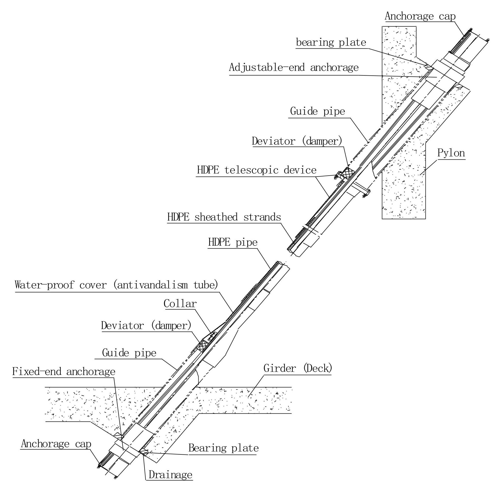 Generally, the OVM250 stay cable system (as shown in figure2) consists of anchorage caps, anchorages (fixed-end anchorage and adjustable-end anchorage) , deviator (or damper) , collar, waterproof cover (or anti-vandalism tube) , HDPE pipe, HDPE sheathed strands and HDPE telescopic device, etc.