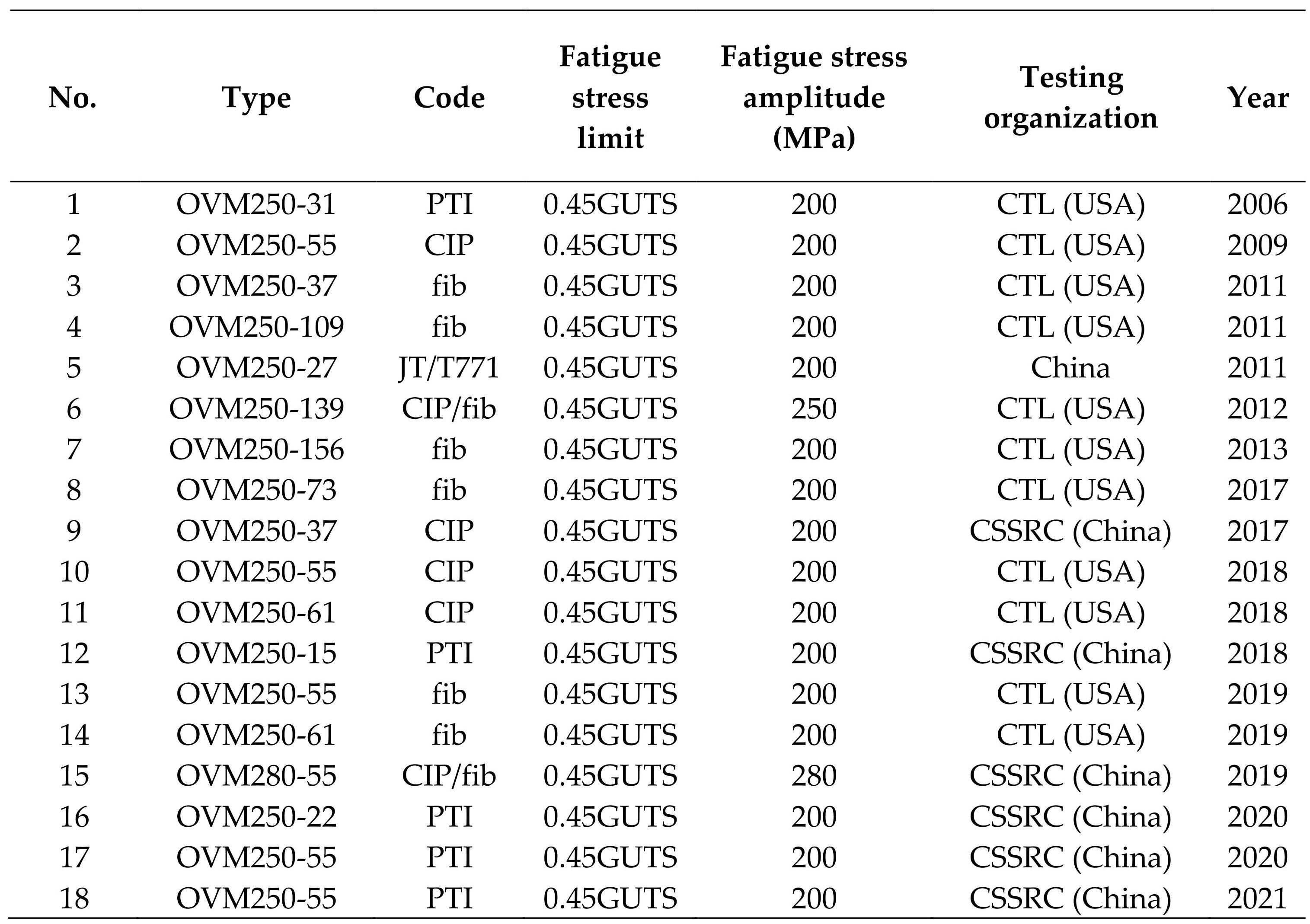 In order to verify the fatigue performance of the OVM250 anchorage system, in the past 15 years, thirty (30) more fatigue tests with test specimens covering the representative designations with 15 to 156 strands have been carried out according to the requirements specified in the Sectra CIP, fib and PTI recommendations, most of which were performed in the USA CTL laboratory. The main fatigue test can be found in Table3.