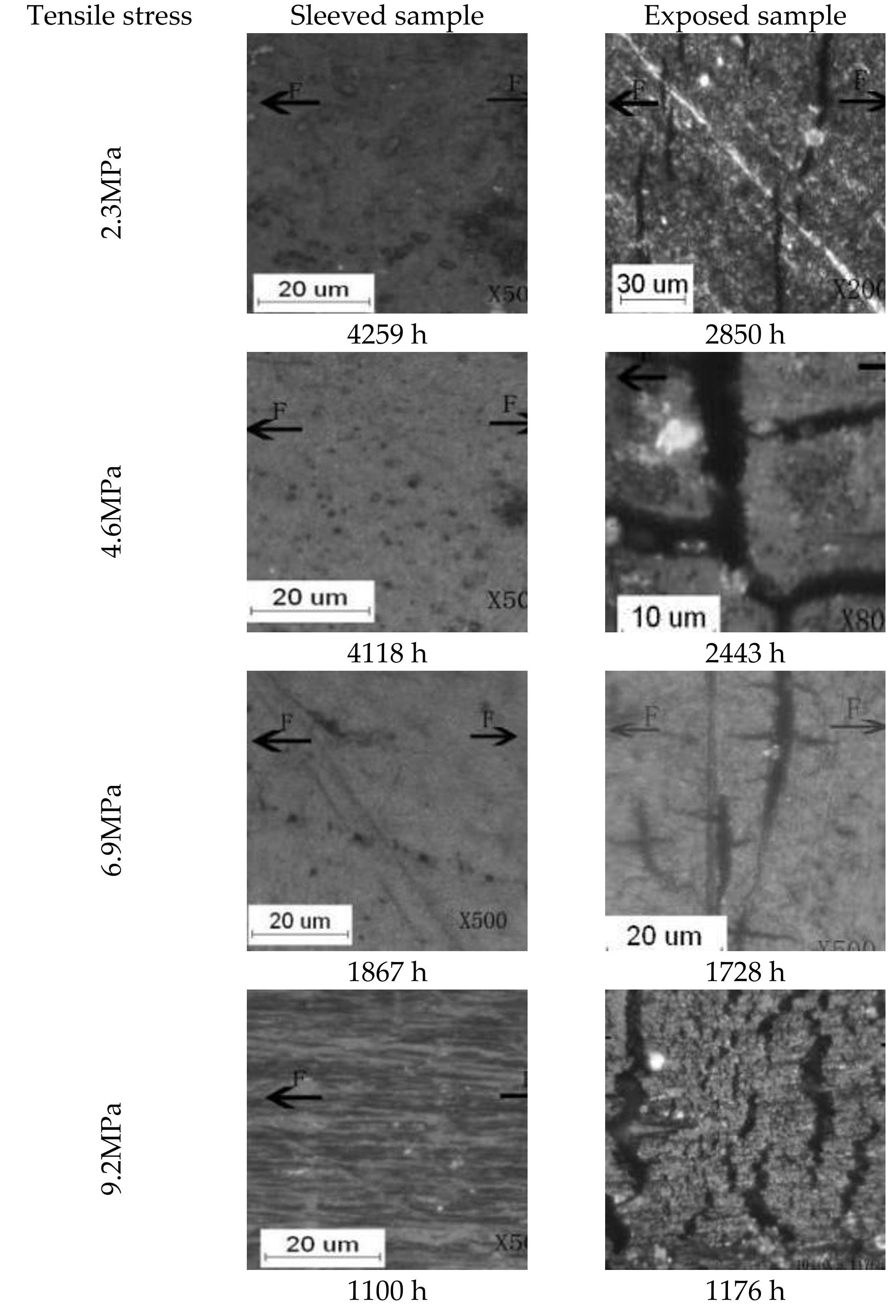 OVM and Sichuan University jointly conducted experimental research on the durability of HDPE pipes. A contrast-accelerated aging test on the HDPE samples under different constant tensile stress was designed and carried out. One set of samples was directly exposed to ultraviolet light, and the other set of samples was sleeved by a tube. In the UV accelerated aging test, the relationship between the agingcracking time and the tensile stress applied to the test samples is shown in Figure6 and Figure7.