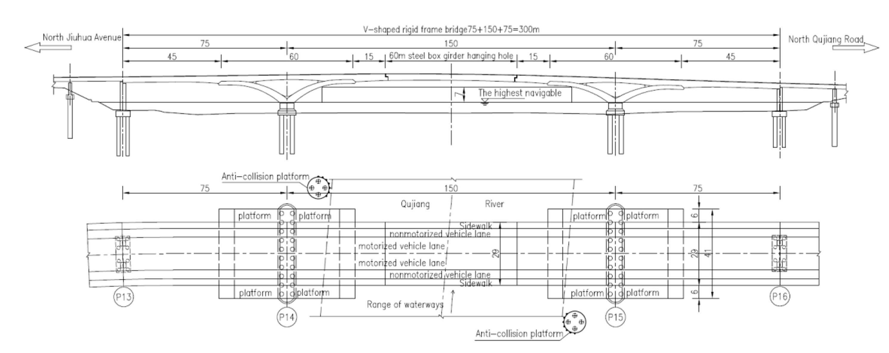 This project is an important passage connecting the central urban area of Quzhou City with the western district. The project starts from Jiuhua North Avenue in the west and connects with the West Road of Dong’an Academy after crossing the Qujiang River. The main bridge crosses the Qujiang River and reserves the navigation clearance of the Class III channel. The west approach bridge is 345 m long and crosses the campus of Quzhou Vocational and Technical College, of which approximately 70 m crosses the school playground runway. The east approach bridge is 50 m long, crossing the Binjiang levee and Qujiang North Road. The total length of the bridge is 695 m, of which the length of the main bridge is 300 m, the length of the approach bridge is 395 m, and the width of the bridge is 29 m.