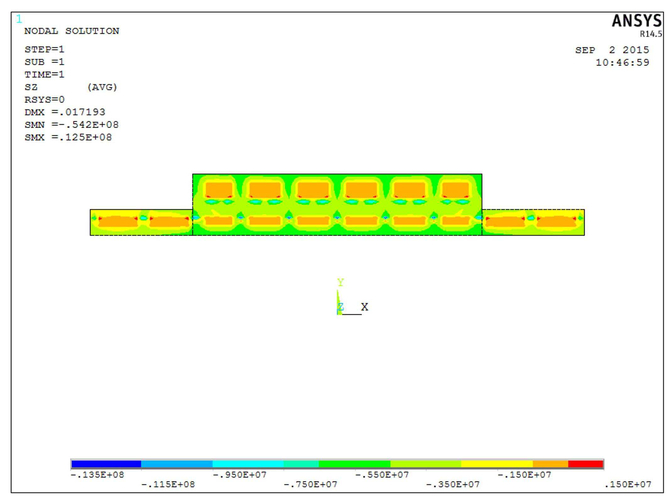 Figure7. Longitudinal stress distribution of the half-bridge model (Unit: Pa)