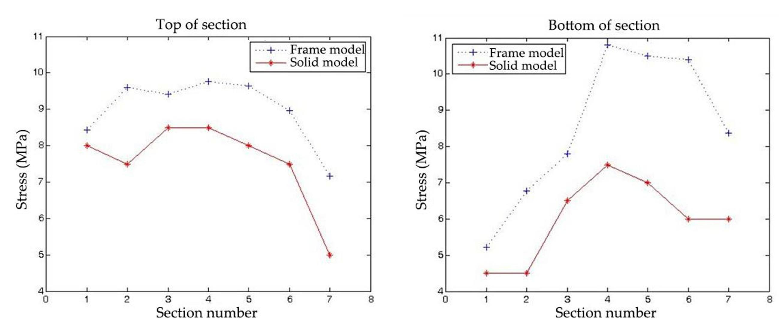Figure10. The section average stresses of the solid model and frame model (Unit: MPa)