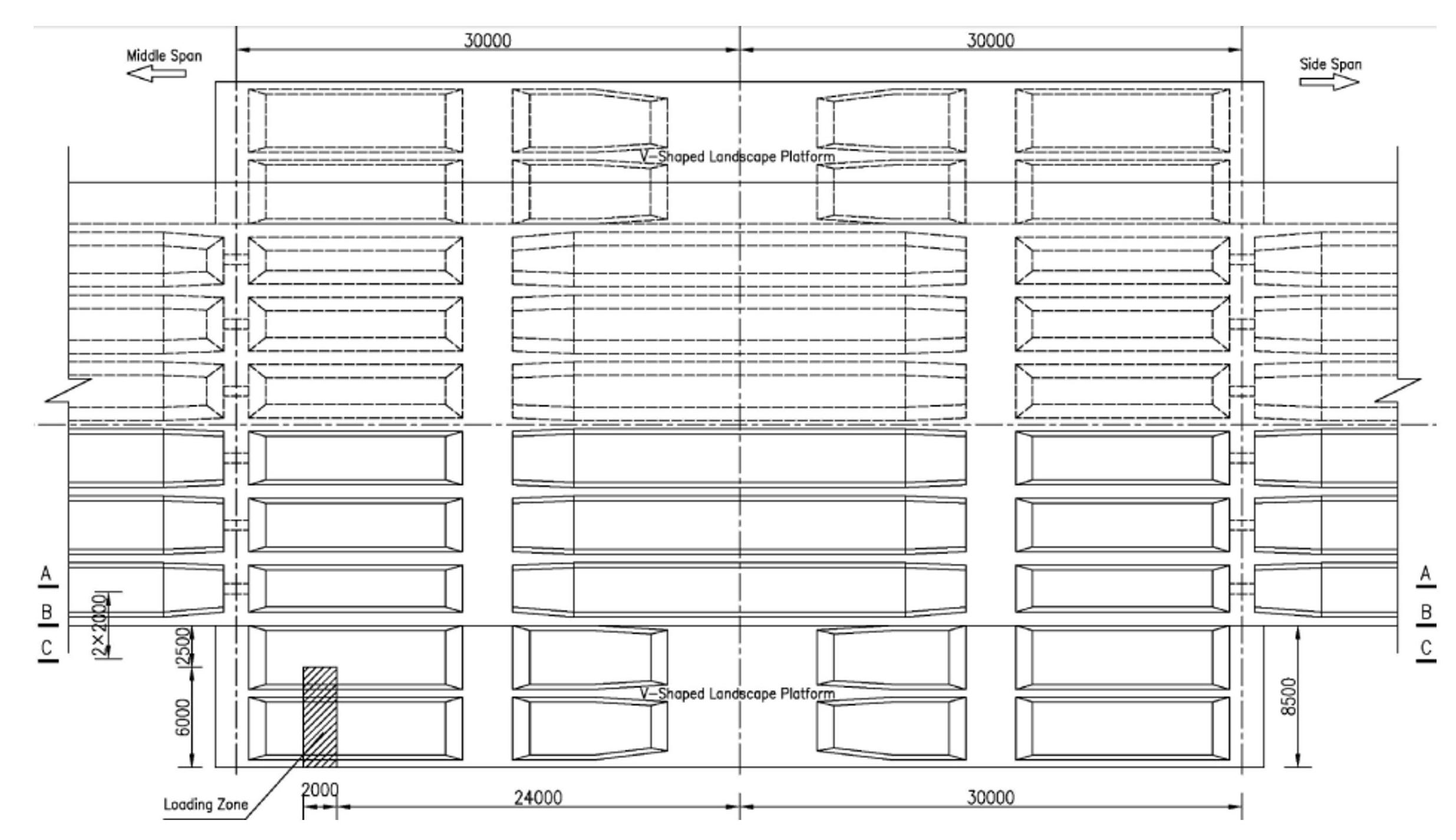 A 216 kN load is applied on the cantilever landscape platform with a curved Vleg to simulate the effect of the footbridge and pedestrian load. Multiple sections along the transverse of bridge are selected according to a certain distance to view the transverse stress distribution. The positions of sections A, B and C are shown in Figure13.