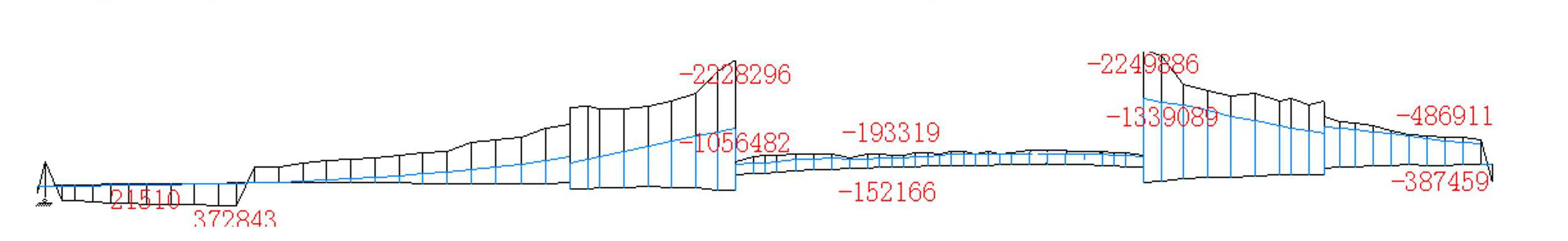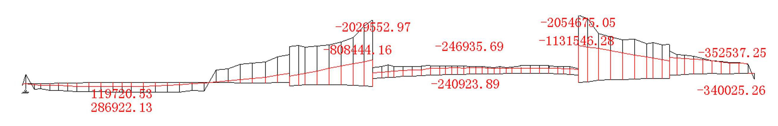 Figure19. The minimum bending moment diagram and bending capacity envelope diagram of the normal section of the left half of the main girder (Unit: kN·m)