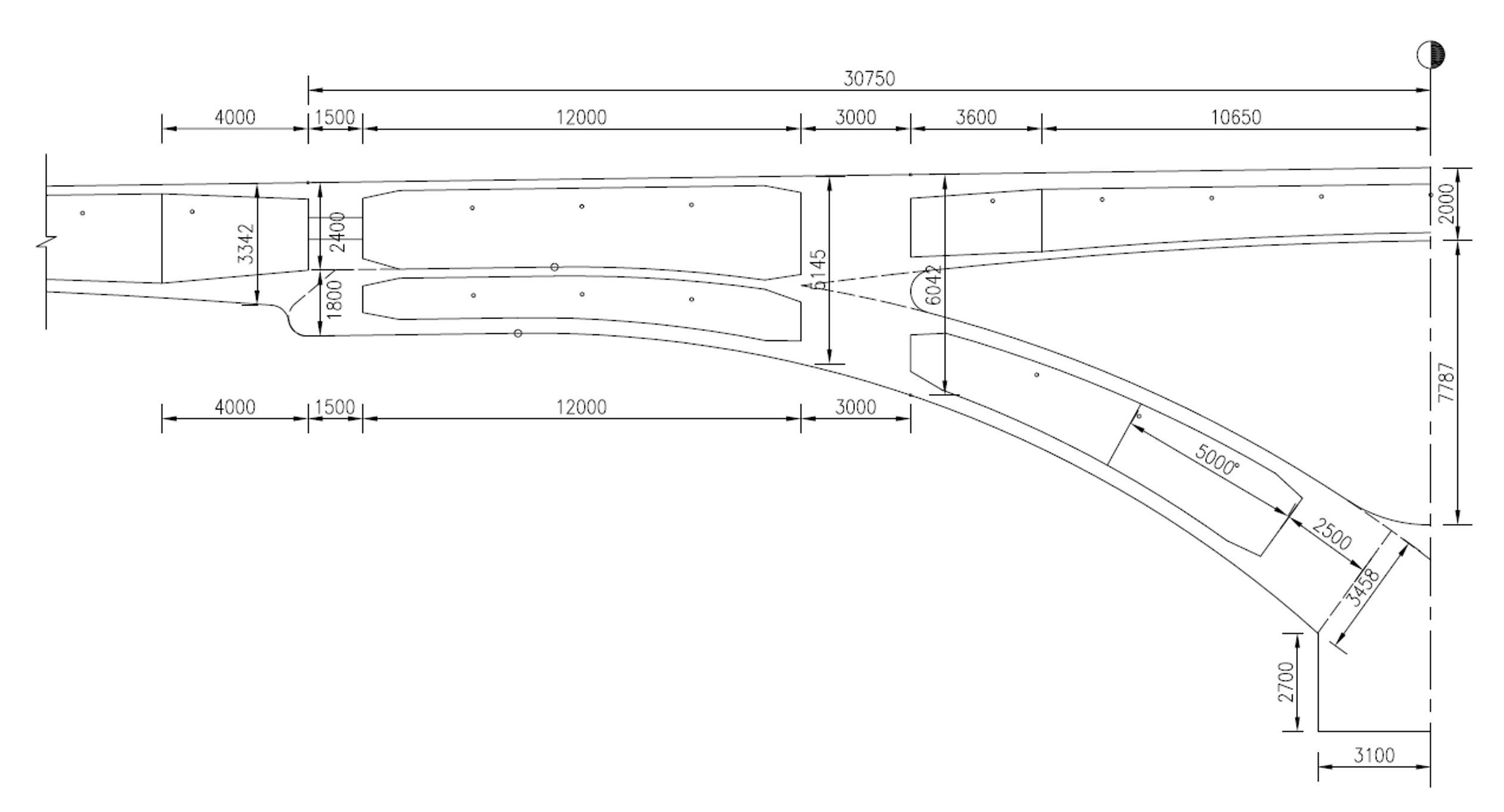 The superstructure of the main bridge adopts a variable cross-section fully prestressed concrete box girder structure except that a steel box girder hanging hole of 60 m is adopted in the middle span. The total length of arc V-leg is 60 m, and the extension on both sides is 30 m.