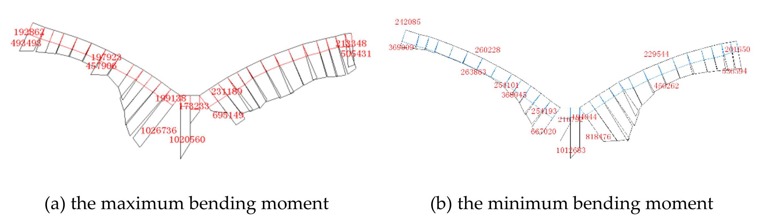 Figure18. The maximum and minimum bending moment diagram and bending capacity envelope diagram of the normal section of the arc V-leg (Unit: kN·m)