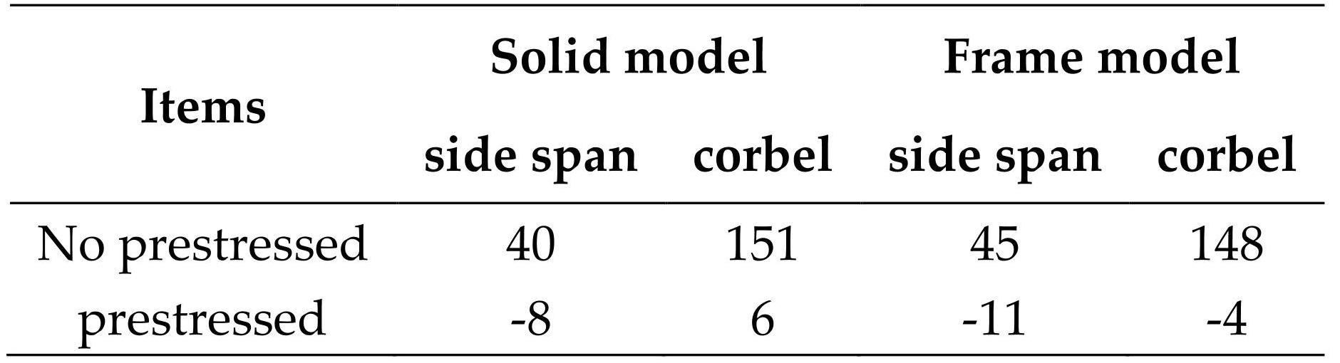 To visually observe the stress and deformation situation, Bridge Doctor V3.2.0 is used to establish a frame model. The modeling method for the frame model is described in section 3.1 below. The deformations of the key points of the structure calculated by the solid model and the frame model are shown in Table1. The displacements of key points of the solid model and frame model are basically the same without prestress. In the prestressed state, the displacement of the two models in the midspan of the side span is basically the same, and the displacement direction of the corbel is opposite. However, considering that the absolute value of the displacement is small, this position is at the starting point of the longitudinal prestressed steel bundle, and the calculation methods of the local prestress loss of the two models aredifferent, so it can be considered that the deformation of the two is still consistent. The vertical deformation of the solid model structure is shown in figure5.