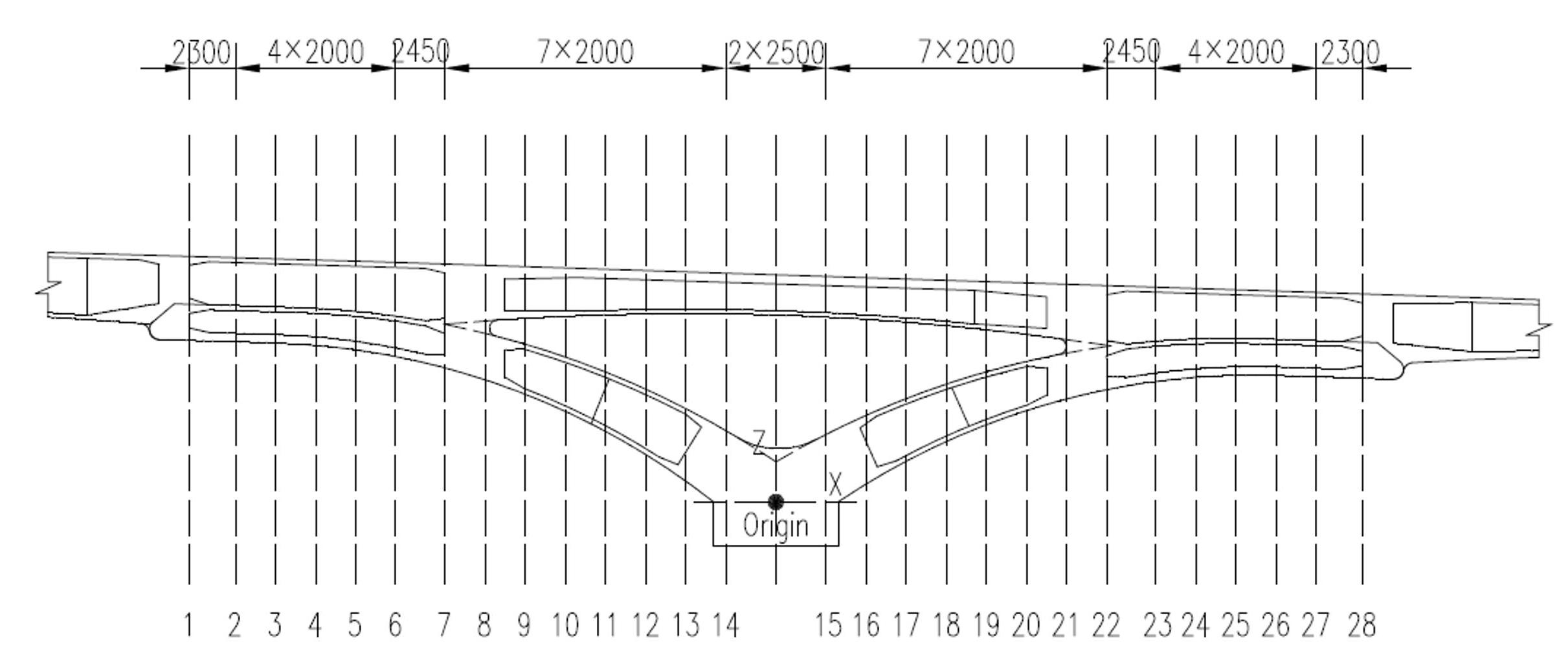 According to the characteristics of the space plate-shell structure formed by the arc V-leg of this bridge, it is necessary to carry out mechanical performance analysis on the following component nodes. (1) Analysis of the mechanical behavior of the joint section of the arc V-leg and the girder, including the distribution of thelongitudinal stress on the section and the transverse stress distribution caused by the arc V-leg landscape platform; (2) Spread of longitudinal stress from the joint position of girder and arc V-leg structure to the joint position of arc V-leg structure and bridge pier, and vertical stress distribution at the bottom of bridge pier.