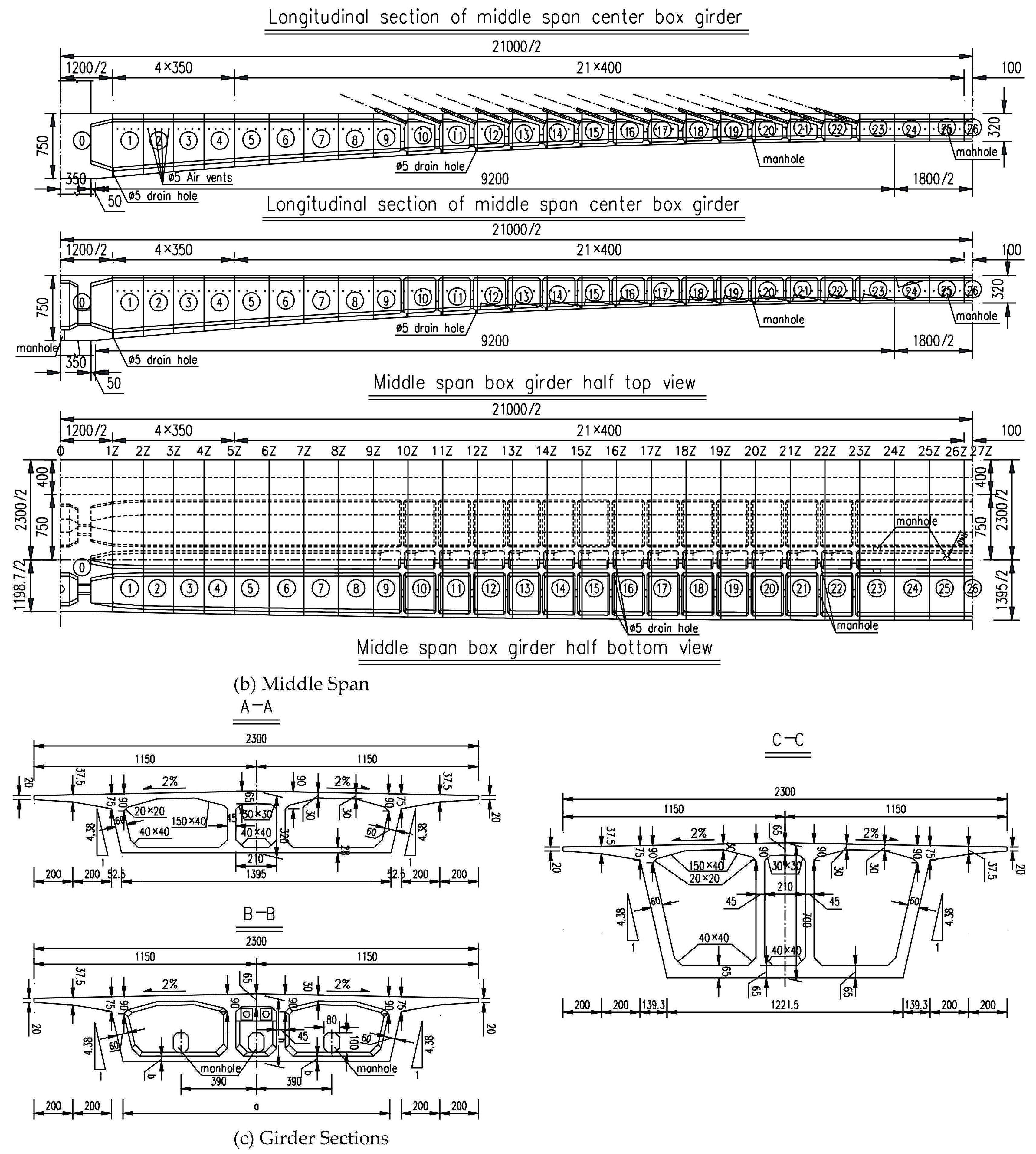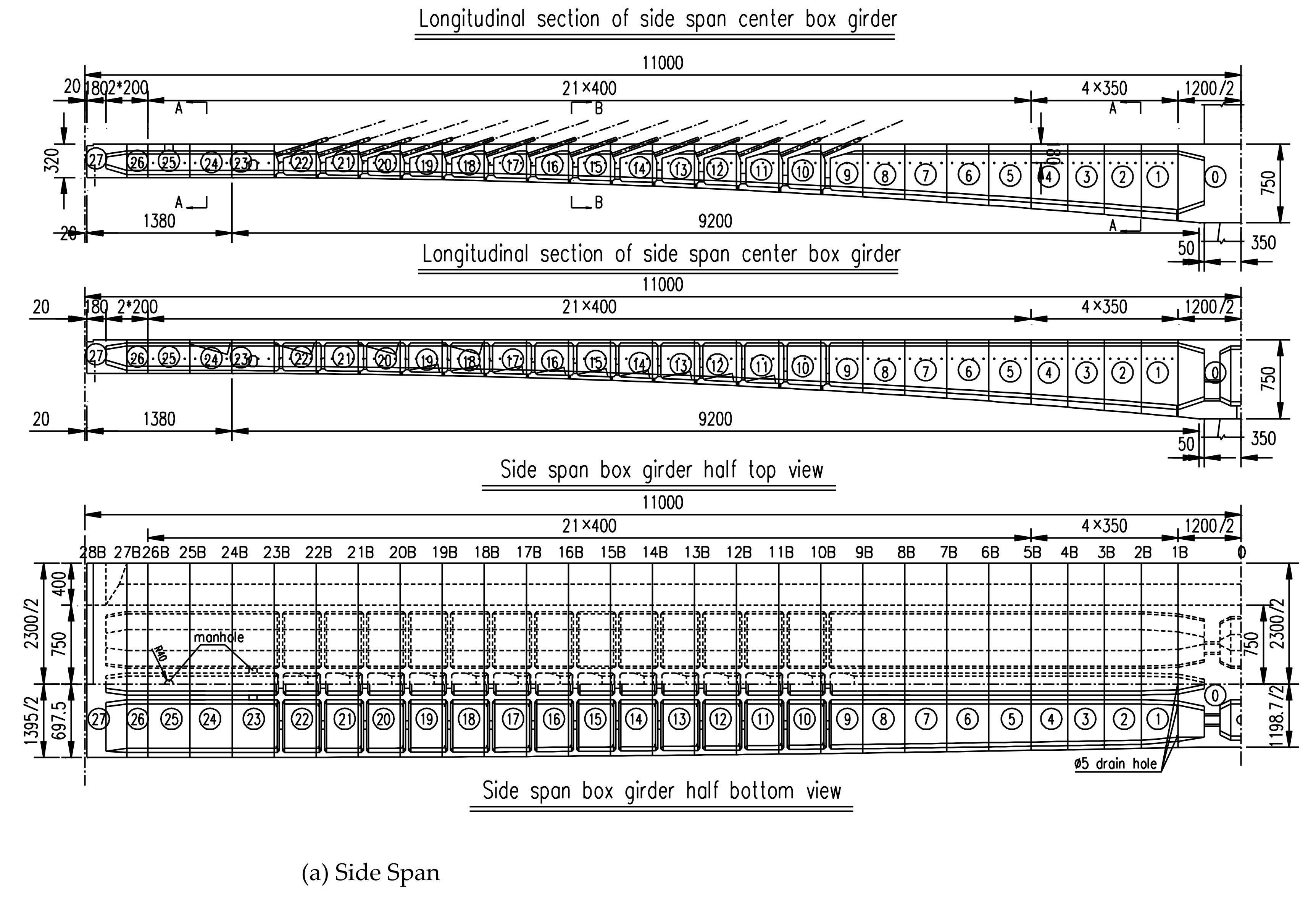 The girder is designed as a fully prestressed element featuring a variable-height single-box three-chamber section. The side webs are configured as inclined webs, and three-directional prestressed tendons are incorporated within the girder. C60 concrete is used for the construction. The girder features a bottom curve shaped like a second-order parabola, with a straight section length of 18.00 m for the middle span and 13.80 m for side spans. The top deck of the girder measures 23.0 m in width, and the cantilever length of the deck measures 4.00 m in length; the height of the girder at the mid-span is 3.20 m, and the girder height at the main pier top is 7.50 m. The top deck is 30 cm thick, whereas the bottom deck thickness increases from 28 cm at the mid-span to 70 cm at the top of the pier; the side webs have a thickness of 60 cm, and the middle web is 45 cm thick. The thickness of the cantilever board is 20 cm at the end, 37.5 cm in the middle, and 75 cm at the root. Transverse diaphragms are installed at the top of the pier and at the anchorages of the stay cables, with manholes incorporated on these partitions. The transverse diaphragm in the central chamber has a thickness of 50 cm, while the transverse diaphragm in the side chambers has a thickness of 30 cm. The thickness of the end beam is 180 cm. The bottom deck of the girder is horizontally level, whereas the top deck features a bidirectional slope of 2%. The zero block of the girder measures 12 m in length, and the standard segment lengths for cantilever construction are available in two options: 3.50 m and 4.00 m. The bridge has 3 closure segments, each measuring 2 m in length; the maximum weight allowed for the cantilever construction segments is 3201 kN. The general structural diagram of the girder is shown in Figure 2.