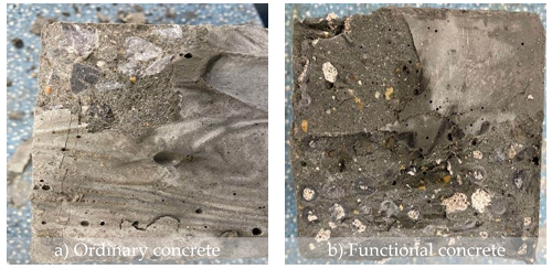 By comparing the two groups, it was found that the compressive strength of the samples decreased when functional aggregates were added. The 7-day and 28-day compressive strengths were approximately 10 MPa lower than those of ordinary concrete but still meet the requirement of exceeding 55 MPa. The fracture surfaces of the compressive test samples are shown in Figure 3. For ordinary concrete, failure primarily occurred along the surface of the coarse aggregates, whereas for concrete with functional aggregates, failure mainly occurred within the functional aggregates.