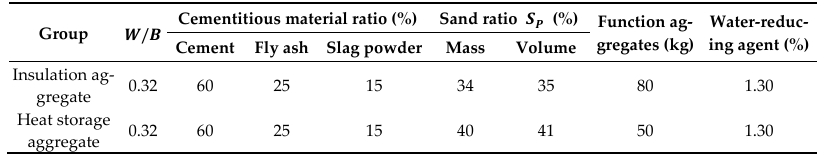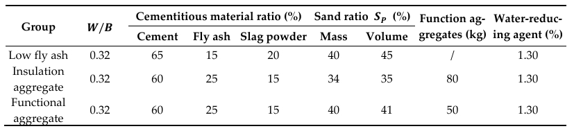 After several trial mix experiments, the preliminary mix proportion was determined. The selected parameters include a 𝑊 /𝐵 ratio of 0.32, a water content of 150 kg, a cementitious material content of 460 kg, and a mineral admixture content of 40% (with a fly ash-to-slag powder ratio of 25:15) . On the basis of the initial mix proportion, further optimization and adjustments were made. Functional coarse aggregates were used to replace5–10 mm coarse aggregates by volume, and insulation functional aggregates were used to replace sand by volume. The optimized mix proportions are shown in Table 16.