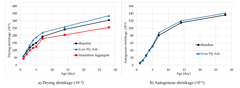 Figure7 a) shows that reducing the fly ash content increases both the drying shrinkage and autogenous shrinkage of the concrete. Compared with the baseline group, the drying shrinkage increased by 13.9% at 7 days and 10.2% at 28 days. This is because the pozzolanic reaction of fly ash (reacting with Ca (OH) ₂ at later stages) results in the filling of pores and refines the pore structure, reducing the number of water evaporation channels. When the fly ash content is reduced, the pore structure becomes coarser, accelerating water loss and increasing drying shrinkage. As shown in Figure7 b) , the autogenous shrinkage of the low fly ash group increased by 8.6% at 7 days and 3.7% at 28 days compared with that of the baseline group. This is because reducing the fly ash content increases the relative cement content, accelerating the hydration reaction and generating more hydration products, which leads to increased autogenous shrinkage and may cause early microcracks.