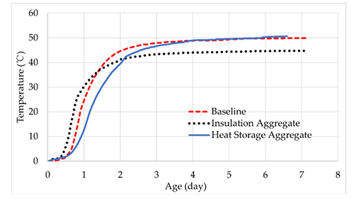 When insulation aggregates were added, the temperature increase in the concrete was delayed, and the peak temperature slightly decreased. When heat storage aggregates were added, the temperature control effects were obvious in the first two days after pouring, effectively slowing the rate of temperature increase.