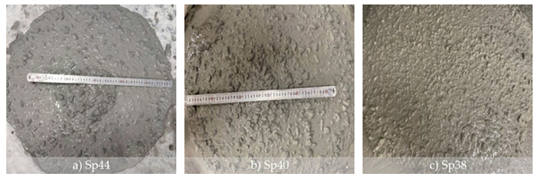 Based on the aforementioned summary, a 𝑊 /𝐵 ratio of 0.323 was selected, with the water content controlled between 145–160 kg to ensure that the total cementitious material content remained below 500 kg. Considering hydration heat, economic factors and engineering experience, the cementitious material content can be as low as 450 kg, with the total admixture content ranging from 35% to 45%. The sand-to total aggregate ratio (abbreviated as the sand ratio, 𝑆 𝑃 ) by mass is between 38% and 45% (40–47% by volume) . To explore the most suitable concrete mix proportions, multiple trial mix experiments were conducted by varying the sand ratio, mineral admixture proportion, and water-reducing agent content.