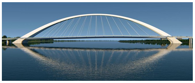 This proposal adopts the core design philosophy of "structure as landscape" [2], emphasizing the structural form itself and minimizing unnecessary decorative elements. This concept perfectly aligns with the clean and efficient load-bearing structure of arch bridges. As an ancient bridge type, arch bridges inherently convey a minimalist aesthetic in their structural behavior, particularly tied-arch bridges. Their force distribution is straightforward (see Figure3) , with no redundant components—each element serves a functional purpose: the arch ribs bear compression, hangers bear tension, and the bridge deck bears vehicular traffic while also functioning as a tie to balance the thrust at the arch ends. The beauty of balance is presented in a dynamic interplay between tension and relaxation. A rendering of the project is shown in Figure 4.