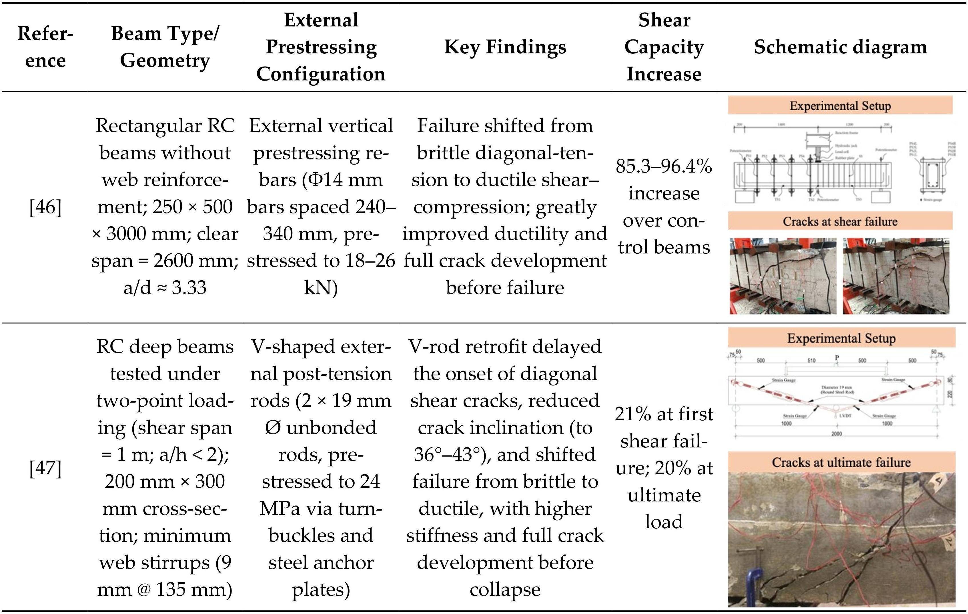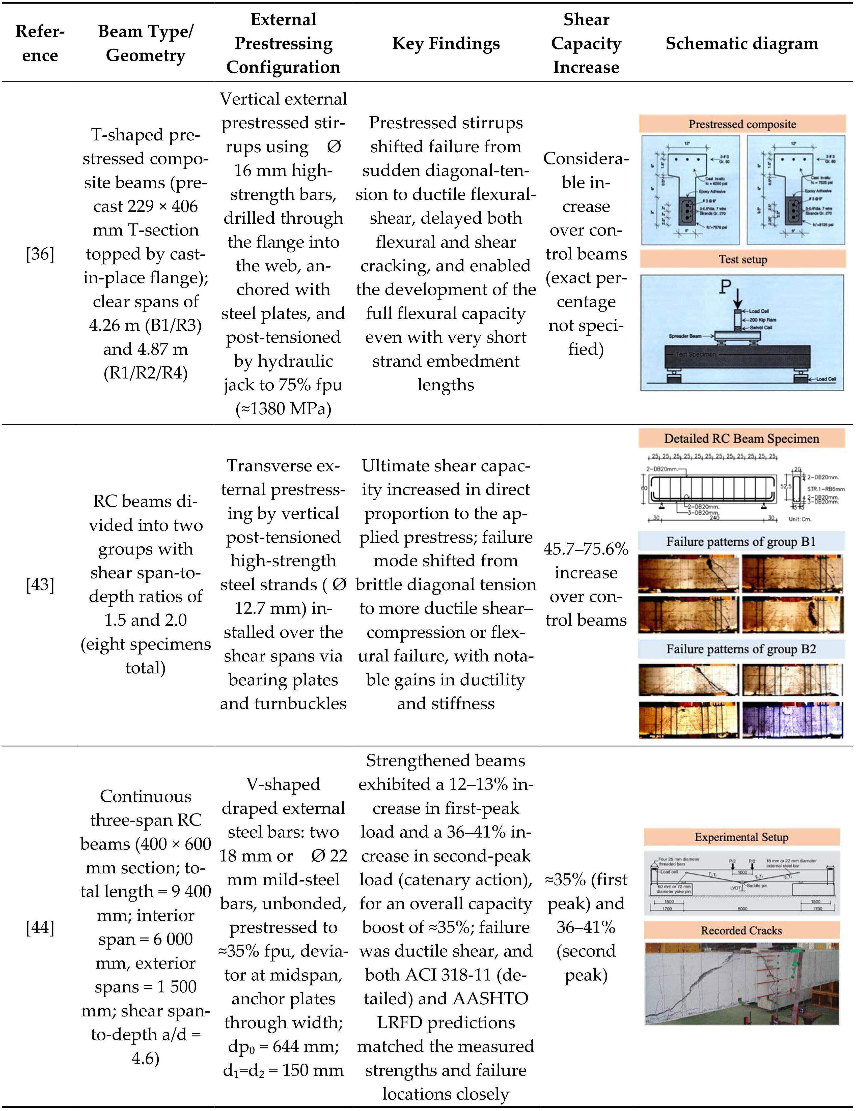 Key findings from these experimental campaigns, such as beam geometries, prestressing configurations, and shear capacity improvements, are summarized in Table2.
