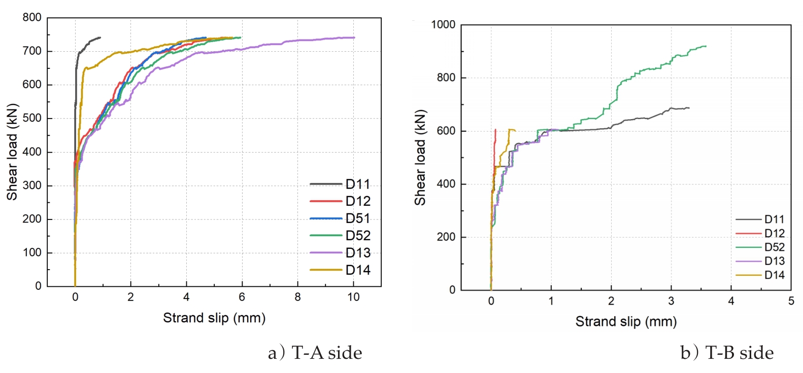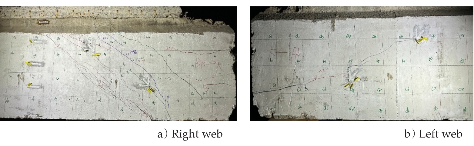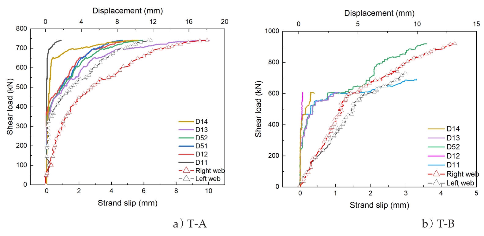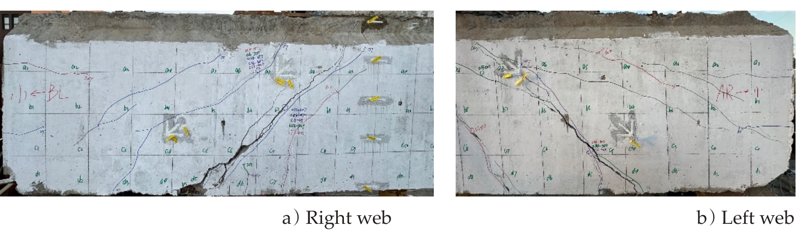 Abstract:This paper presents an experimental investigation into the shear capacity of prestressed concrete (PC) hollow core slabs with and without pre-existing oblique crack damage. A salvaged hollow core slab from Taihe Road Viaduct was selected for testing, with one end exhibiting in-service crack damage (T-A side) and the other end remaining intact (T-B side). Both ends were subjected to static loading to failure, and their shear performance was compared. The results indicate that the ultimate shear capacity of the damaged T-A side was approximately 16% lower than that of the undamaged T-B side. The damaged end also exhibited a lower cracking load, greater ultimate deflection, and greater torsional deformation. Both ends failed in a "bond-shear" mode, but the presence of pre-existing cracks on the T-A side exacerbated crack propagation and led to a wider main failure crack. The experimental results were used to evaluate the accuracy and applicability of several shear capacity calculation methods, including JTG 3362—2018, AASHTO LRFD Specifications 2020, ROSS, Naji, and Zhang's models, and the Response2000 program. The comparison reveals that Zhang's model and the ROSS model provided the most accurate predictions relative to the experimental values. The AASHTO LRFD method was found to be slightly unconservative for the damaged side while providing a conservative prediction for the undamaged side. This study highlights the detrimental effects of in-service cracks and reveals limitations in some conventional codes for assessing damaged members.