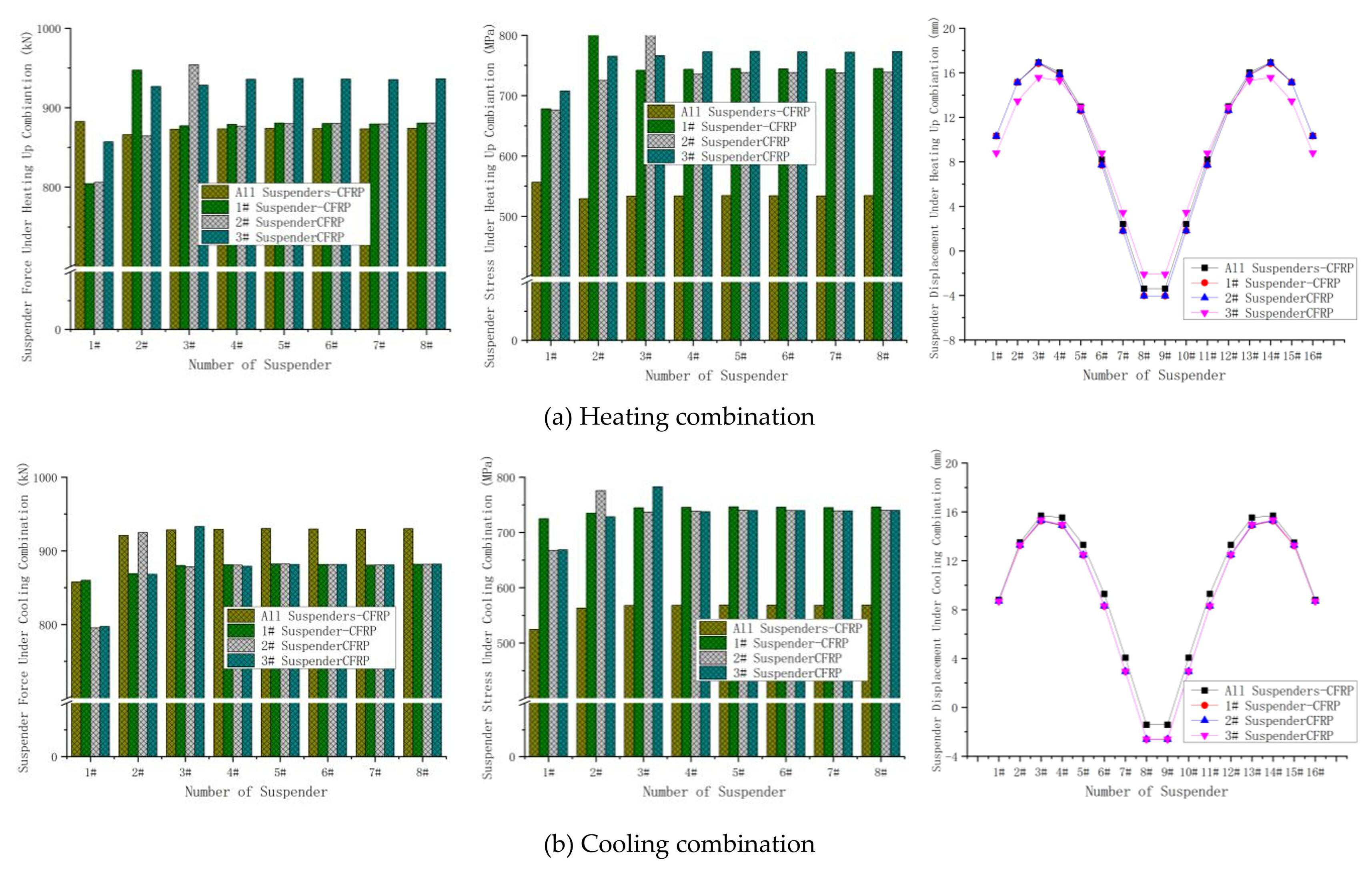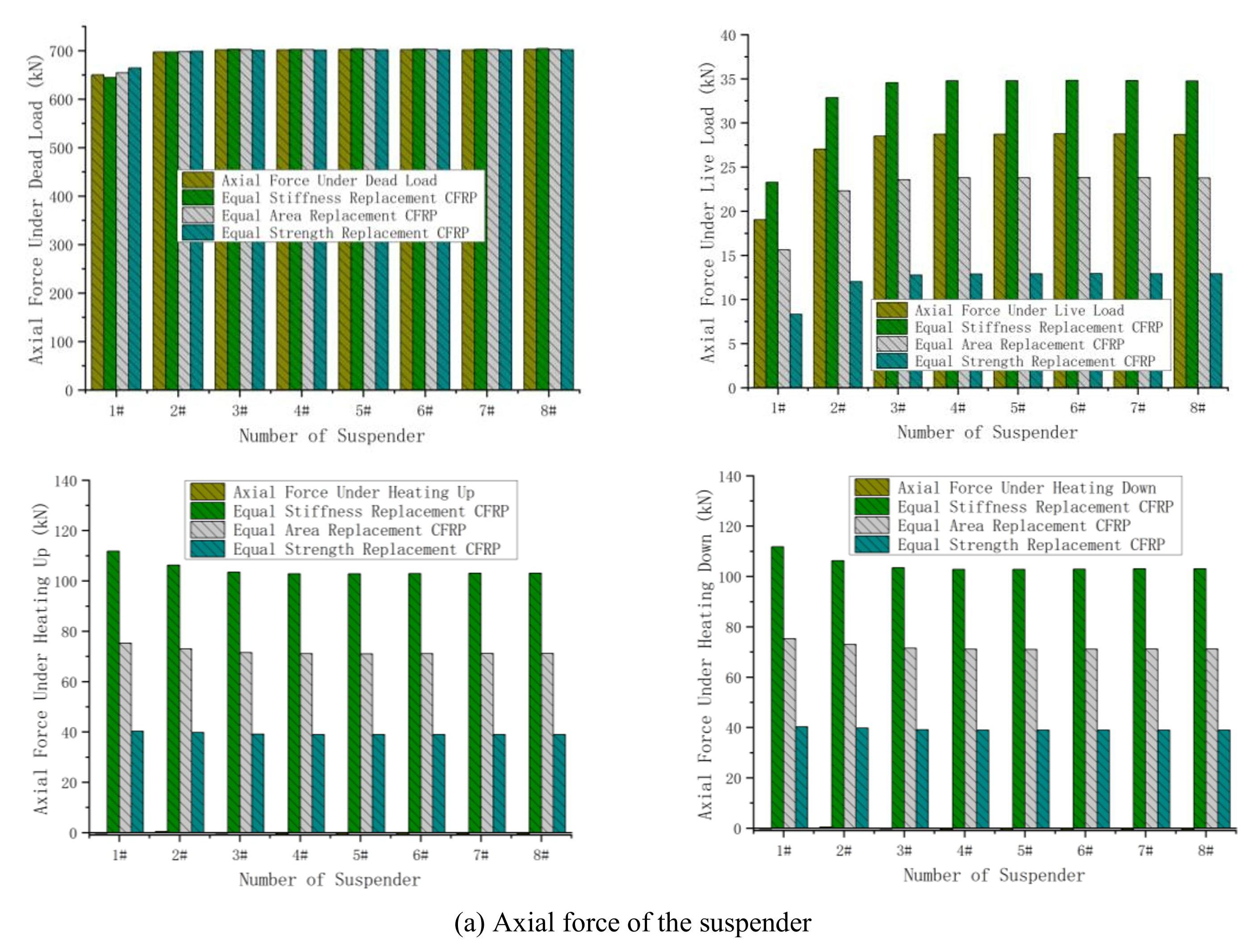 Therefore, this paper proposed a scheme of replacing the short suspenders of the tied arch bridge with CFRP suspenders and carried out finite element analysis. In view of the actual situation in which the short suspenders in the triangular area of the tied arch bridge are easily damaged, only suspenders #1, #2 and #3 were replaced with CFRP suspenders, and results were compared to those with all suspenders replaced by CFRP suspenders. The differences in the axial forces, stresses and displacements of the suspender under dead load, live load, heating up and cooling down combination were analyzed, as shown in Figure 8.