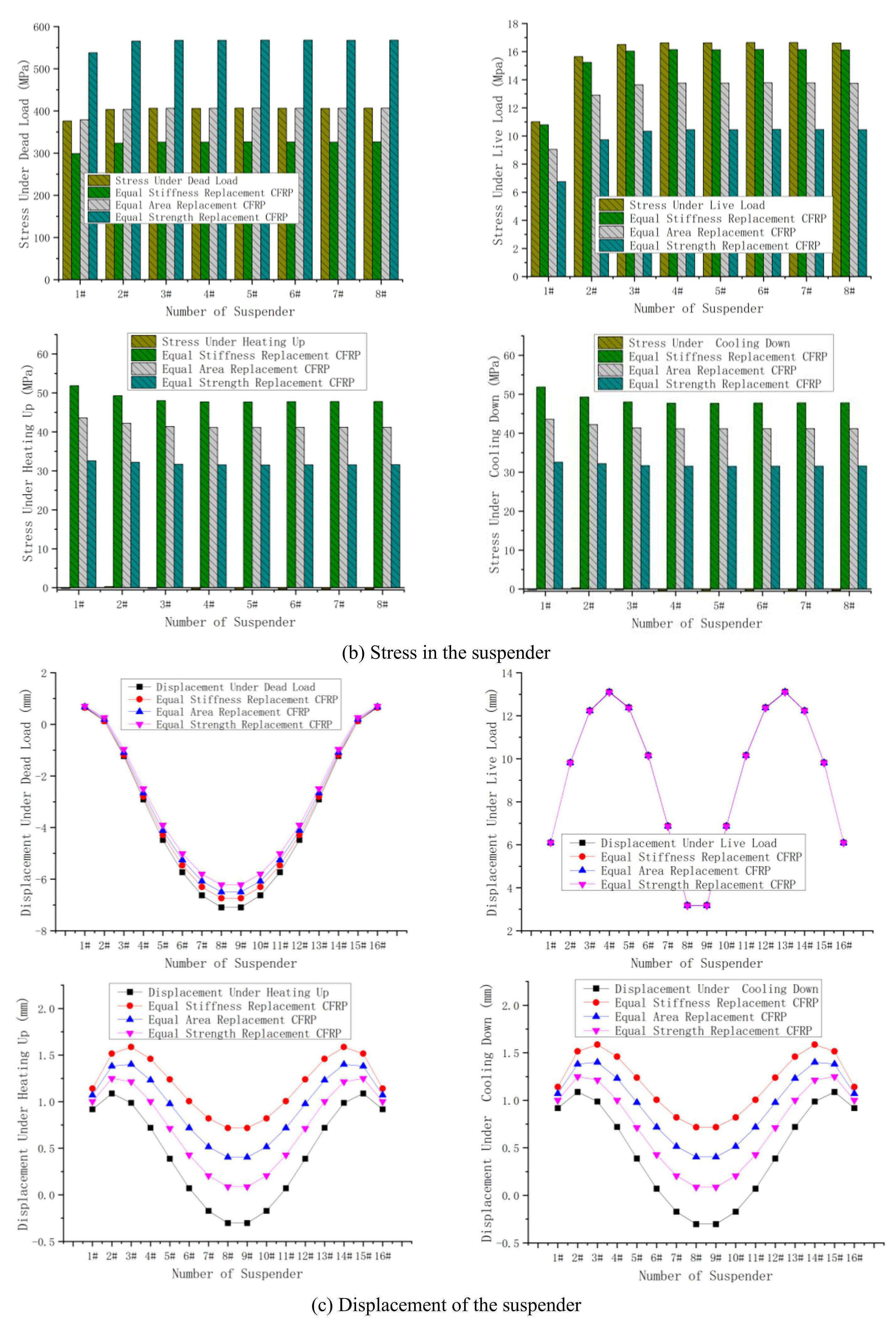 Under dead load, the displacements of the suspenders when only one CFRP suspender is used are almost the same and larger than those in the case of all suspenders replaced by CFRP suspenders. Under live load, the displacements of the suspenders when only one CFRP suspender is used are the same as those in the case of all suspenders replaced by CFRP suspenders. Under the influence of temperature rise and fall, the displacements of the suspenders are larger than those in the case of all suspenders replaced by CFRP suspenders, but the difference between working conditions is small.