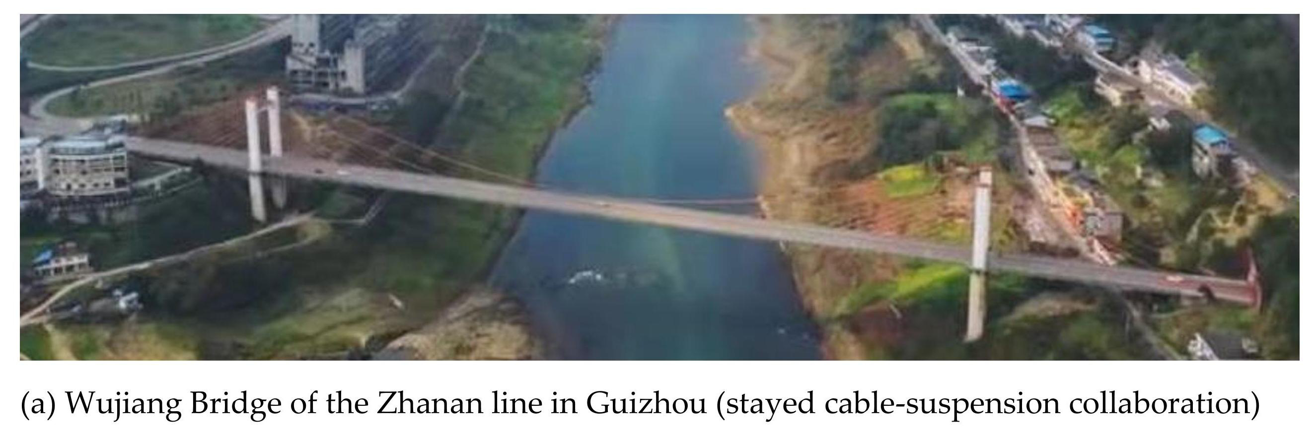 With the growing demand for developing China's transportation systems, the functional requirements for bridges have further increased. However, the development of basic bridge type structures is constrained by factors such as the materials used and the forces acting on the structure [1]. In comparison to basic bridge type structures, collaborative system bridges can use the force characteristics of various basic bridge type structures, collectively sharing the load. They exhibit significant advantages in aspects such as ultra-large-span bridges and optimized structural forces, making them more favorable in the field [2-4]. The stayed cable-suspension collaborative system bridge, due to its integration of the characteristics of the stayed cable bridge and suspension bridge, holds great potential in the development of ultra-large-span bridges. This approach has gained favor from bridge researchers worldwide, and various stayed cable-suspension systems have been proposed [5-7], as shown in Figure 1. In addition, various collaborative system bridges, such as stayed-cable-beam collaboration, are being constructed and developed in different parts of the world [8, 9].