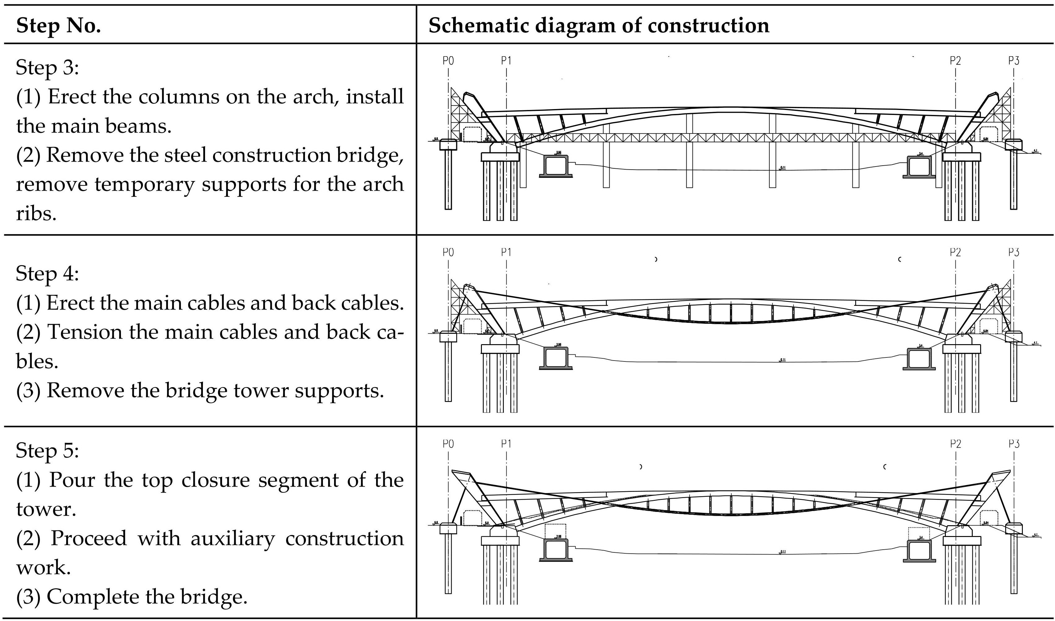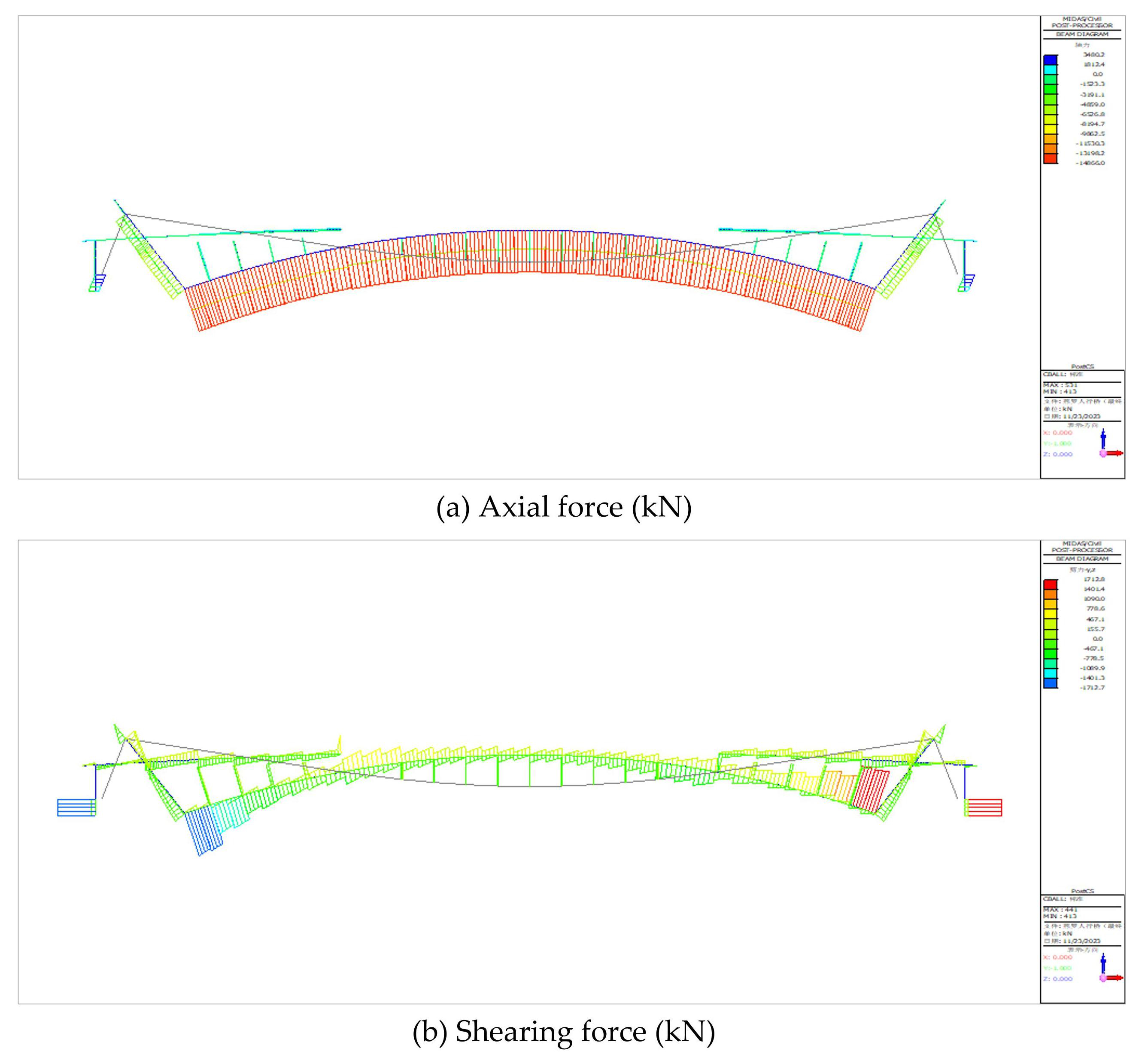(3) The main cables of the lower segment of the arch rib, through vertical braces, share the load with the main arch, improving the mechanical performance of the main arch and enhancing its stiffness.