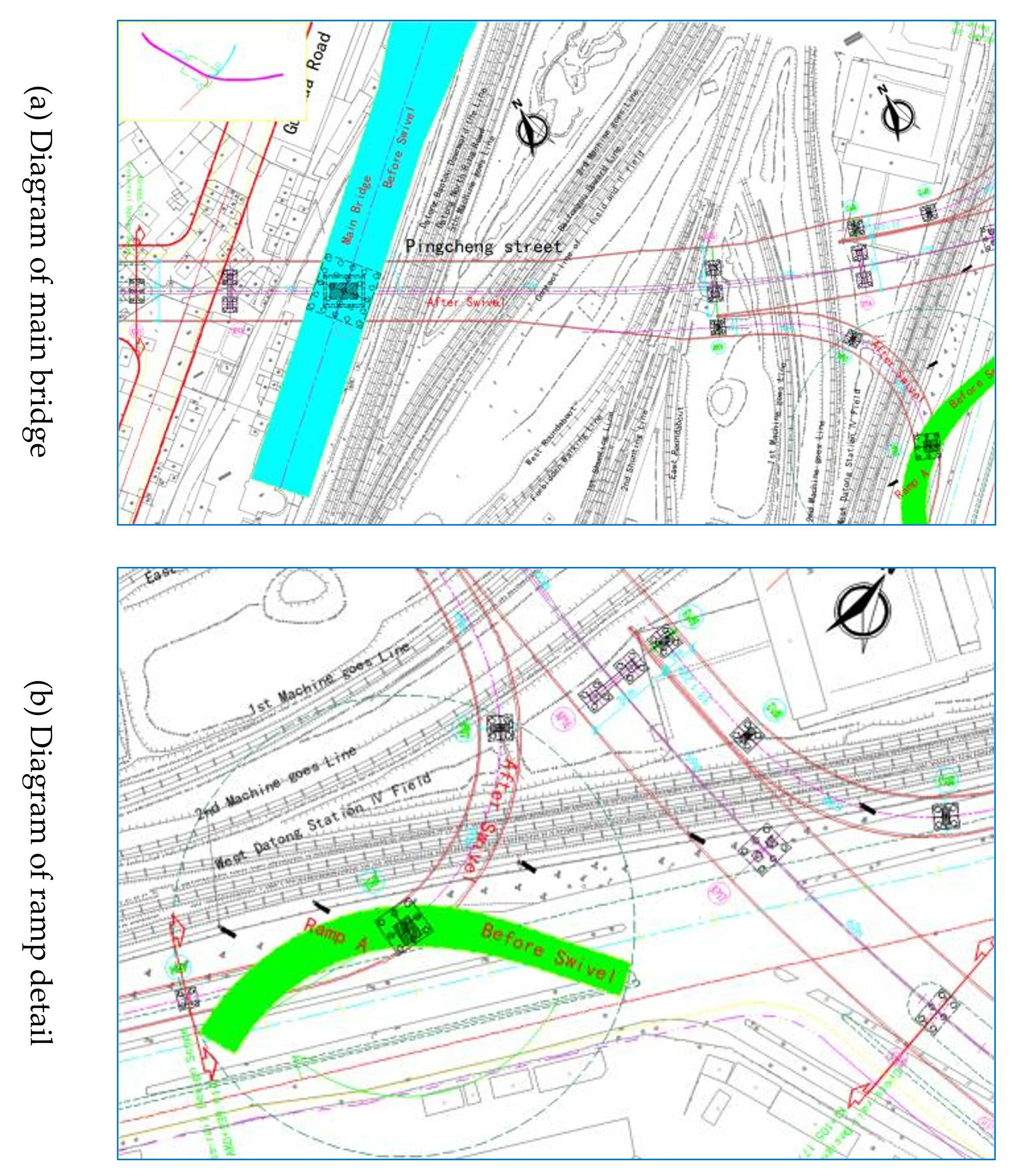 The main bridge and approach bridges span 15 railway lines. The main bridge is designed as a (163+91) meters single-tower single-cable plane cable-stayed bridge, while the approach bridges are designed as continuous steel box girders with spans of (65+59+62) meters. Ramps A and B serve as the lower and upper ramps of the main road, respectively. Ramp A is a curved bridge with a total length of approximately 648.0 meters. The standard width of the ramp bridge is 9.0 m, and the main beam type is a continuous steel box girder. Both the main bridge and the ramp A bridge are constructed by swivel, and this report only involves the ramp A bridge. The diagram of the existing railway and swivel construction scheme for ramp A are shown in Figure 1.