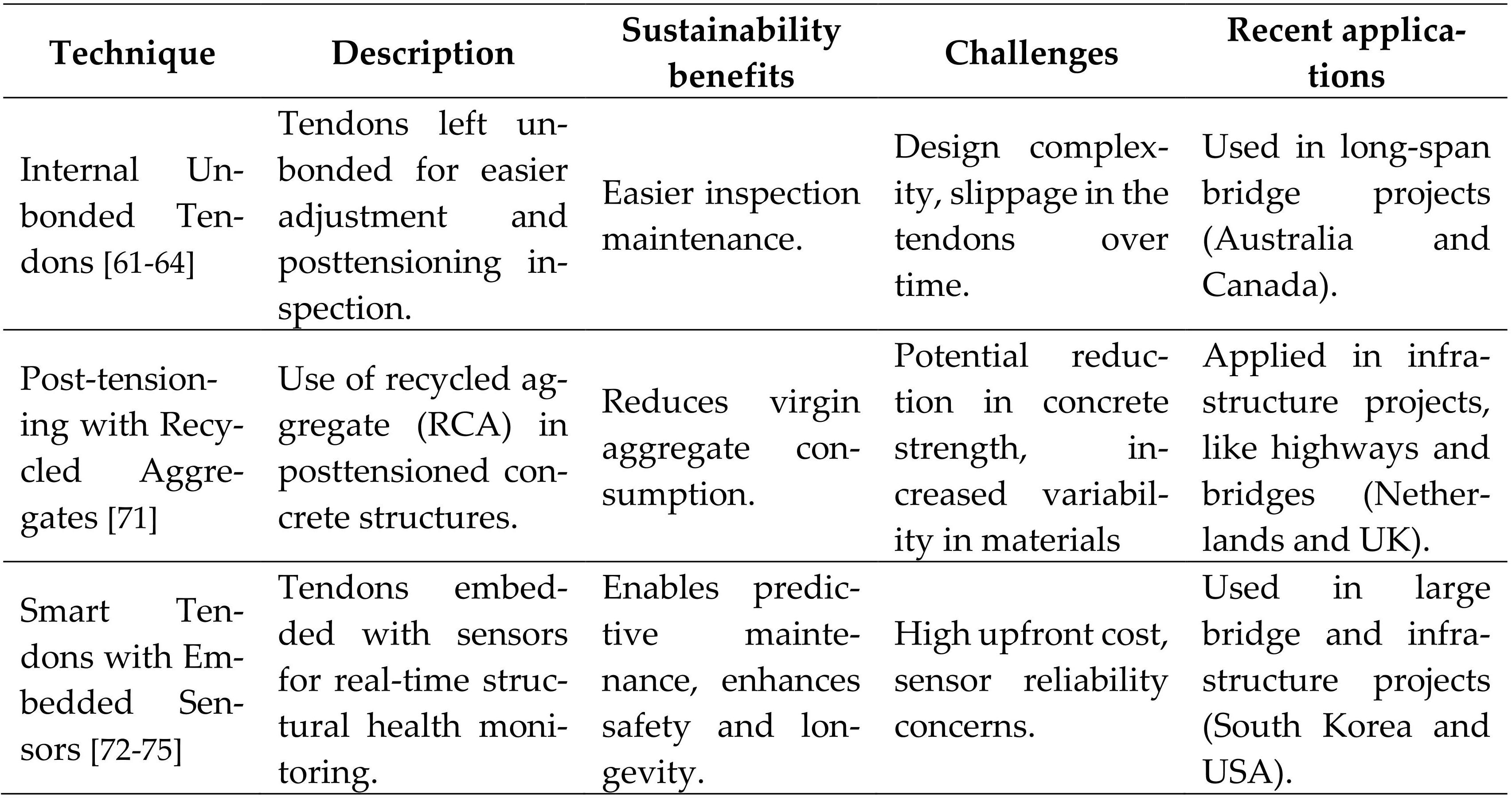 Recent advancements in prestressing techniques have emphasized sustainability by reducing environmental impacts and enhancing structural efficiency. This section reviews innovative methods that contribute to green construction in prestressed concrete bridges, focusing on low-carbon prestressing methods and the integration of smart technologies.