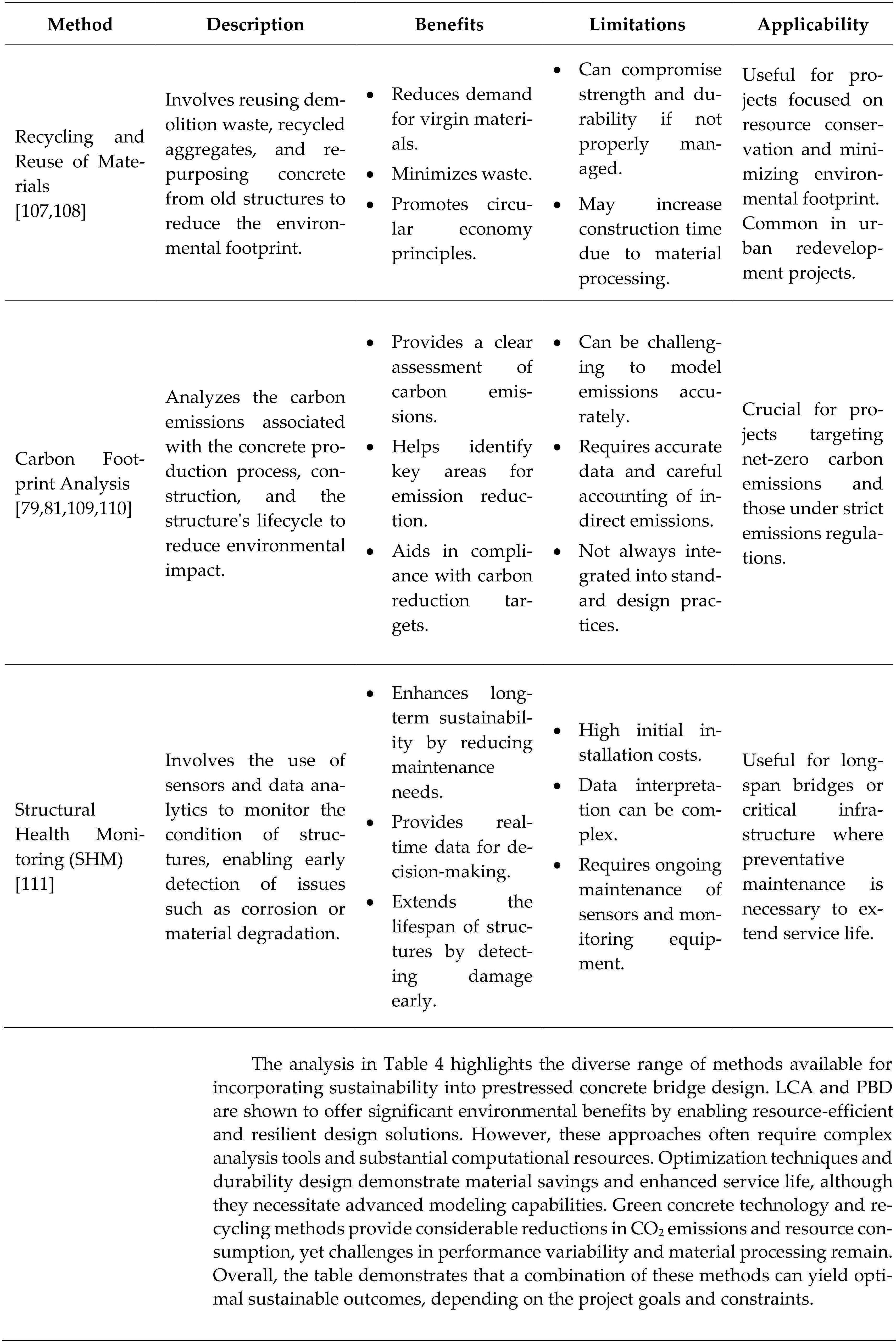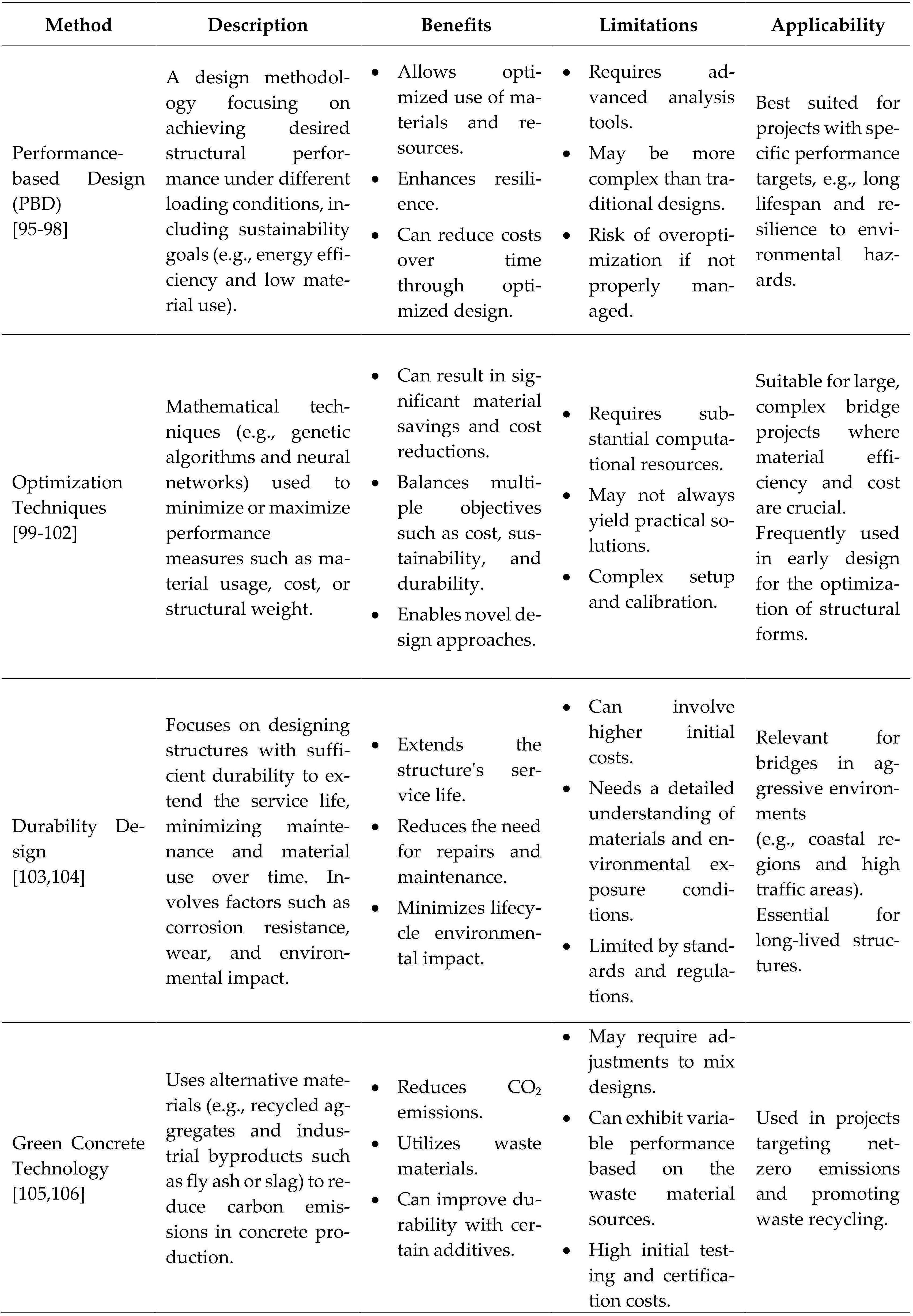 1 Introduction 2 Sustainable Materials in Prestressed Concrete 2.1 Use of Recycled Concrete Aggregates 2.1.1 Properties of RCA in Prestressed Concrete 2.1.2 Recent Research and Applications 2.2 Supplementary Cementitious Materials 2.2.1 Impact on Concrete Performance 2.2.2 Recent Developments 2.3 Alternative Prestressed Materials 2.4 Summary and Implications 3 Innovative Sustainable Prestressing Techniques 3.1 Low-Carbon Prestressing Methods 3.1.1 Energy-Efficient Production Processes 3.1.2 On-site Practices Reducing the Environmental Impact 3.2 Smart and Adaptive Prestressing Systems 3.2.1 Self-monitoring Structures 3.2.2 Adaptive Prestressing Techniques 3.3 Summary and Implications 4 Design and Analysis Strategies for Sustainable Bridge Engineering 4.1 Lifecycle Assessment for Sustainable Bridge Design 4.1.1 Evaluating Environmental Impacts 4.1.2 Incorporation into Design Codes 4.1.3 Case Studies 4.2 Performance-Based Sustainable Design 4.2.1 Balancing Structural and Environmental Objectives 4.2.2 Optimization Techniques 4.2.3 Case Studies 4.3 Durability Design for Extended Service Life 4.3.1 Durability Modeling 4.3.2 Service Life Prediction 4.3.3 Sustainable Maintenance Strategies 4.4 Summary and Implications 5 Discussion and Implications 5.1 Advantages of Sustainable Prestressing Techniques 5.2 Advanced Prestressing Techniques 5.3 Challenges and Future Directions 5.4 Implications for Sustainable Infrastructure 6 Conclusions 6.1 Key Findings 6.1.1 Sustainable Materials Integration 6.1.2 Innovative Prestressing Techniques 6.1.3 Design and Analysis for Sustainability: 6.2 Recommendations for Practitioners 6.2.1 Adoption of Sustainable Materials 6.2.2 Implementation of Innovative Techniques: 6.2.3 Integration of Sustainability in Design 6.3 Recommendations for Researchers 6.3.1 Material Development and Characterization: 6.3.2 Development of Design Guidelines and Standards: 6.3.3 Addressing Implementation Challenges: 6.4 Concluding Remarks