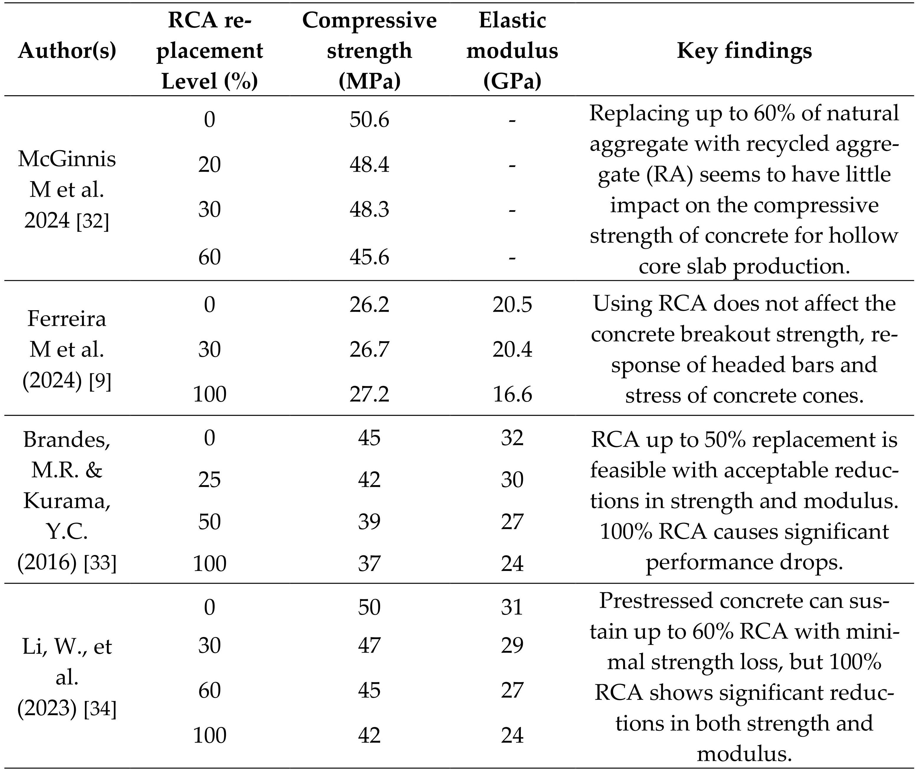 Recent studies have extensively investigated the integration of Recycled Concrete Aggregates (RCA) in prestressed concrete, focusing on maintaining mechanical performance while increasing sustainability [40]. These studies have explored various RCA replacement levels to understand their effects on properties such as compressive strength and elastic modulus. Key techniques, such as presoaking RCA to improve workability and the use of mineral admixtures to enhance durability, have been employed to counterbalance the inherent variability of RCA [32]. Table 1 summarizes recent research findings, detailing the effects of different RCA replacement percentages on the compressive strength and elastic modulus of prestressed concrete, as well as other relevant observations.