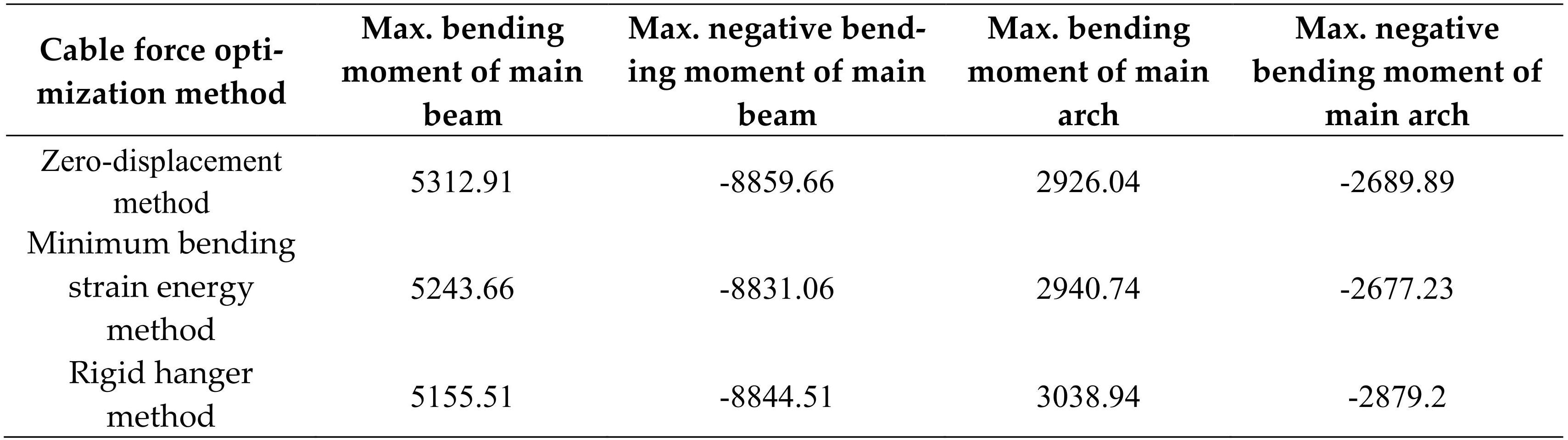 The differences in the optimized cable force obtained by different optimization methods are minimal, primarily affecting the side hangers and uniformity. However, the internal forces of the main beam and arch ribs after optimization are very similar.
