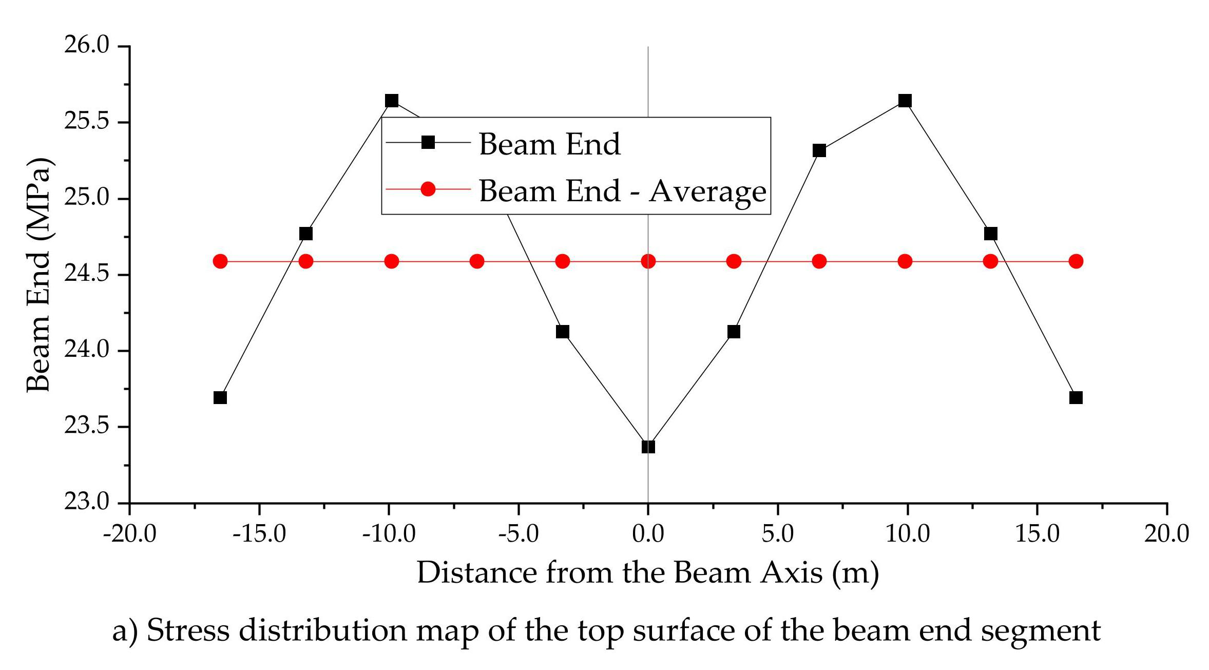 Table4 shows that under the combined action of dead load and cable forces, the difference between the actual normal stress and the average value for the beam end segment is 1.8 MPa; for the mid-span segment, it is 1.9 MPa; and for the root segment, it is 2.6 MPa.