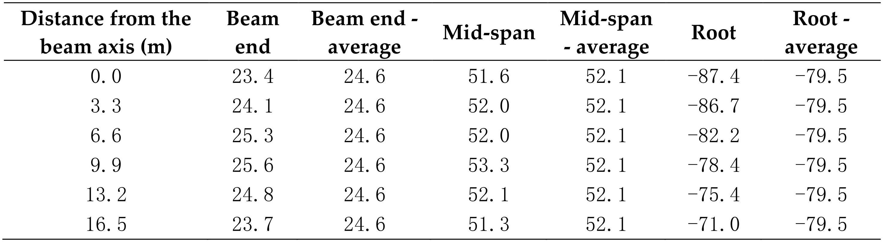 Table2 shows that under the action of a dead load, the difference between the actual normal stress and the average value for the beam end segment is 0.9 MPa, that for the mid-span segment is 1.0 MPa, and that for the root segment is 8.5 MPa.