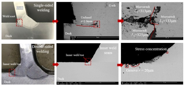 This project team focuses on the connection welds between U-ribs and bridge deck plates, which are the most critical areas susceptible to fatigue damage. Through full-scale tests on nine plate elements, a comprehensive theoretical analysis model was established for the nucleation and propagation of microshort cracks as well as the propagation of macrolong cracks. A high-quality, full-penetration welding joint and technique for U-ribs (Figure 9) was developed, significantly reducing the initial microcrack size in the welds from 300 to less than 20 (Figure 10) . The fatigue design strength of the welded details between the longitudinal ribs and top plates improved substantially from 80 MPa to 125 MPa. This achieves full penetration and inspectability of the welds, maximally eliminating initial defects and enhancing the fatigue durability of orthotropic steel bridge decks.