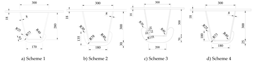 The welds connecting the U-ribs to the diaphragm plates experience extremely complex stress, with significant welding deformation and residual stress. This makes them more susceptible to stress concentration and initial welding defects, leading to stress amplitudes under loads that exceed the fatigue limit values. Consequently, this can result in fatigue damage and even the formation of fatigue cracks. Various national standards stipulate that no weld access holes should be set at the welding positions between the top plate and longitudinal ribs as well as the diaphragm plates. However, weld access holes are allowed at the welding positions between the diaphragm plates and the bottom of the U-ribs (see Figure12) . Setting openings at these welding positions can effectively reduce the stress levels of these structural details, and different opening forms have varying effects on the stress state of fatigue prone areas in the diaphragm plates. For this project, a comparative analysis was conducted on four different opening forms (see Figure 12) .