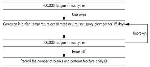 To address the simultaneous corrosion and fatigue effects on the main cables, a special dry‒wet alternating corrosion‒fatigue coupled test was performed, in which an SF06 salt spray chamber and a100 kN axial tensile fatigue testing machine were used to conduct dry‒wet alternating corrosion‒fatigue coupled tests. Under different stress amplitudes, the following cycle was adopted: fatigue stress cycle → high temperature salt spray wet corrosion → room-temperature salt spray deposition dry corrosion + fatigue stress cycle → high-temperature salt spray wet corrosion → room-temperature salt spray deposition dry corrosion + fatigue stress cycle. This cycle of uneven corrosion and fatigue alternations continued until the steel wire experienced corrosion‒fatigue fracture, and the number of fatigue cycles to failure and the corrosion state of the wire surface were recorded. The process is shown in the following diagram: