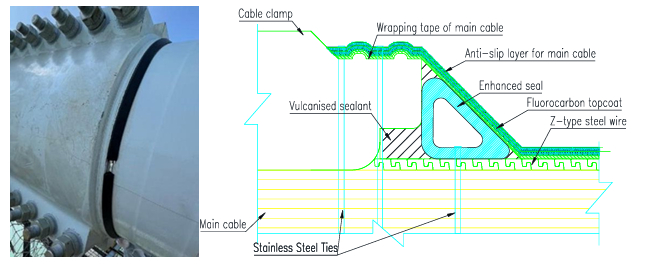 The Shenzhen-Zhongshan Cross-sea Bridge is equipped with two main cables, each with a diameter of 1053 mm, and cable clamps with a diameter of 1066 mm.Each main cable consists of 199 strands, with each strand consisting of 127 high strength steel wires, each having a diameter of 6 mm and a nominal tensile strength of 2, 060 MPa. To adapt to the high-temperature, high-humidity, and high-salinity environment of the Lingdingyang Sea area, the main cable wires are coated with a zinc‒aluminum multicomponent alloy. Additionally, a three-layer protection system is employed: a Z-shaped wire + wrapping tape + dehumidification system.