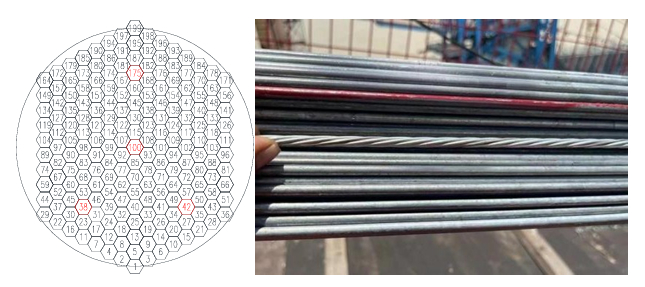 To monitor the temperature and humidity inside the main cables, the Shenzhen Zhongshan Link has, for the first time in the world, installed four smart strands within the main cables. Specifically, one steel wire each from the central100# strand and the surrounding38#, 42#, and 175# strands were selected (see Figure18) , with fiber Bragg grating (FBG) temperature and humidity sensors installed along their entire length at intervals of 1 to 1.5 meters. Using a combination of FBG sensor technology and ultralong strand encapsulation techniques, this project has developed 3000-meter-class ultralong smart strands for the first time, providing foundational data for scientific dehumidification. The smart strands are led out from the anchorages at both ends of the main cables, and special thermal insulation measures are employed to avoid the impact of the480 °C high temperature during the casting of the anchors.