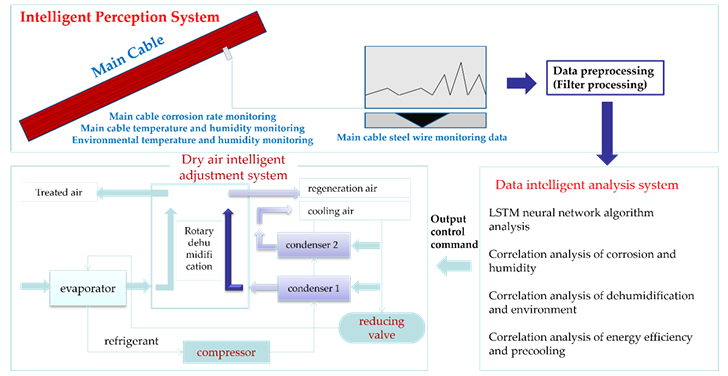 As shown in Figure19, after preprocessing (filtering) the monitoring data of the temperature, humidity, and main cable corrosion rate, the data are input into anintelligent analysis system. After the correlations between corrosion and humidity and between dehumidification and environmental factors are analyzed, control parameter commands are output to the intelligent dry air regulation system; this enables intelligent adjustment of the main cable humidity, ensuring that the humidity at the air preparation station outlet and the inlet clamp is ≤ 40% RH and that the humidity at the exhaust clamp is ≤ 50% RH.